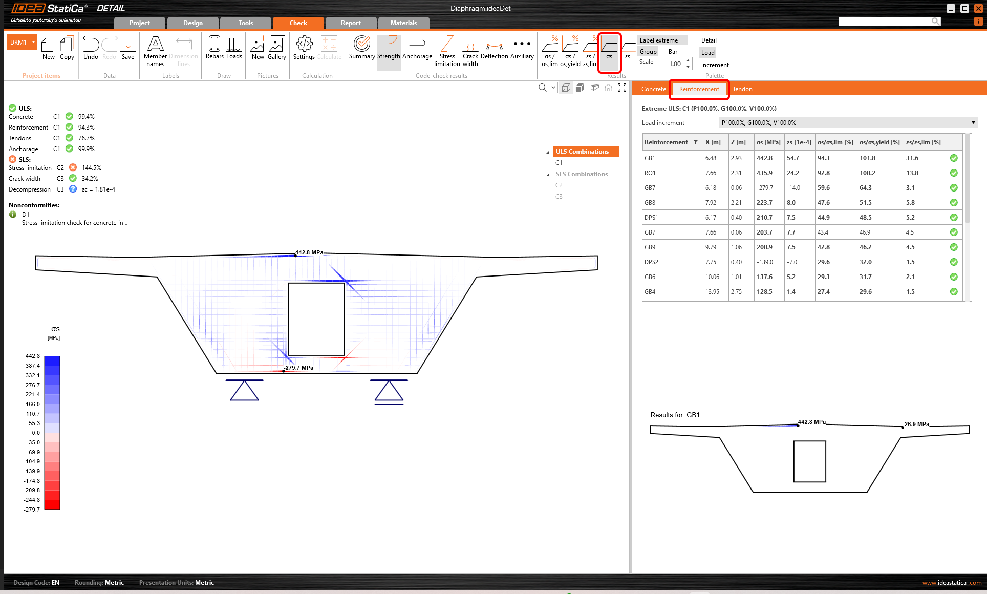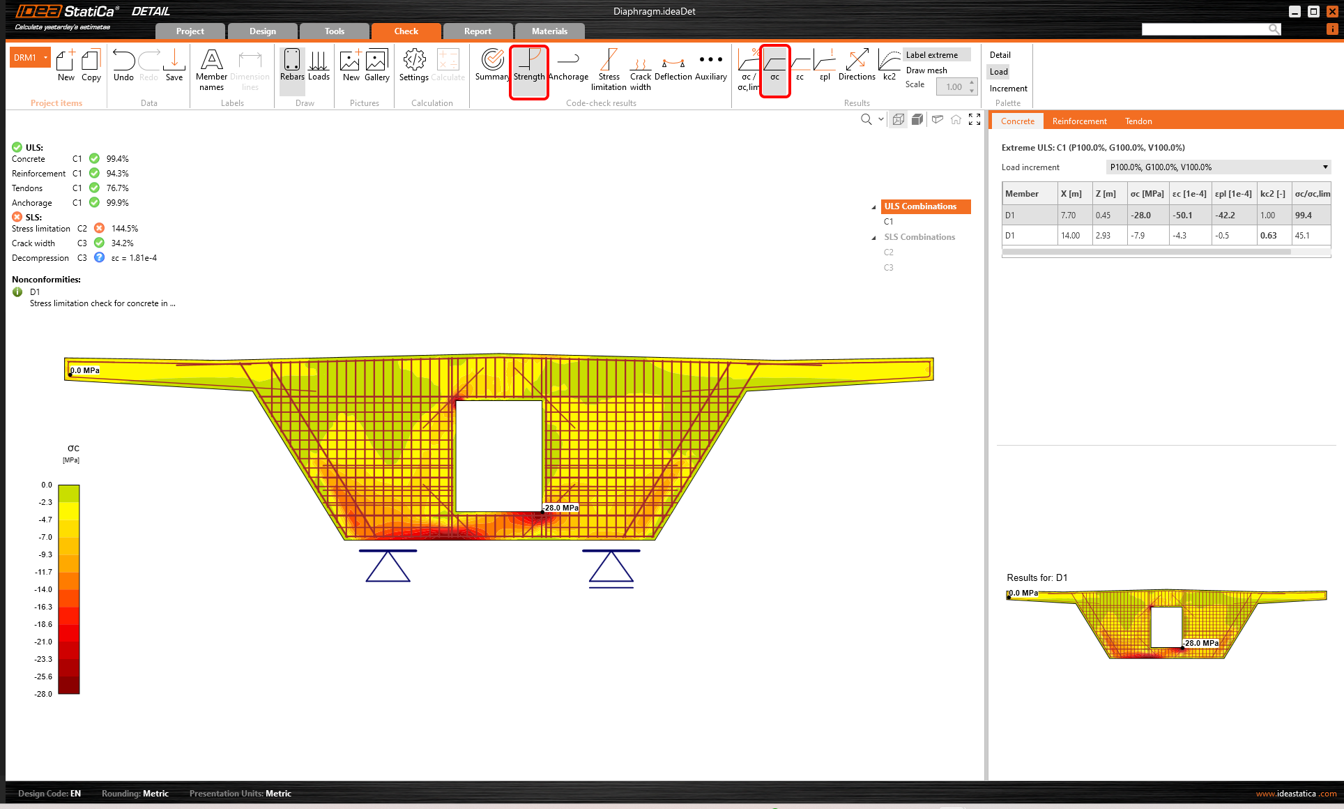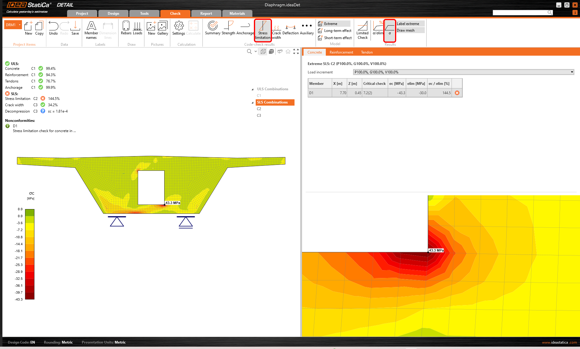 The SLS results can be found under the Stress, Cracks and Deflection tabs. In the Stress tab, you will find that the stress in concrete in the bottom corner is unsatisfactory. There is a stress peak.