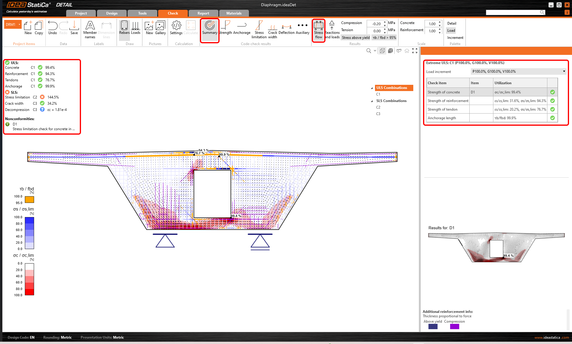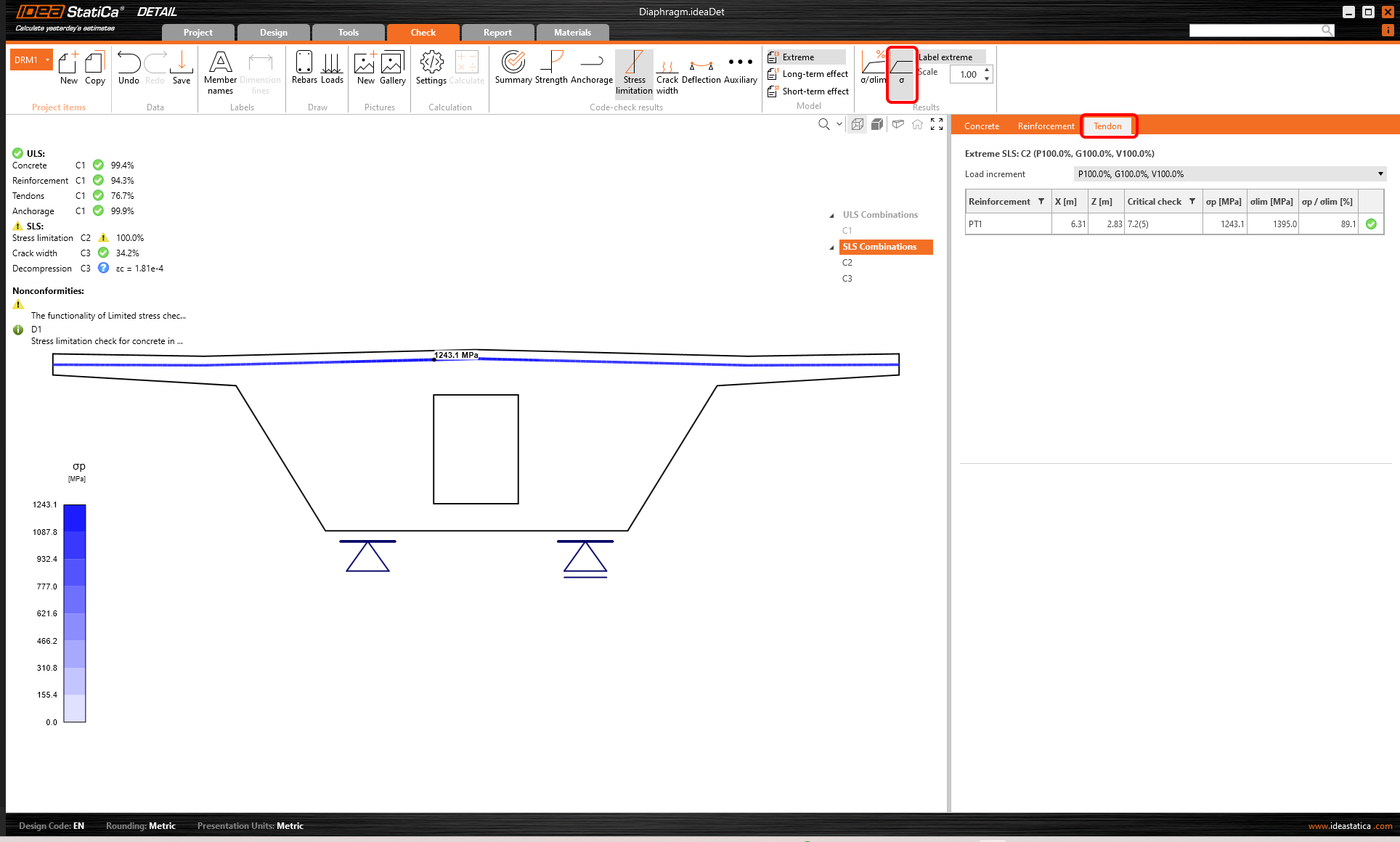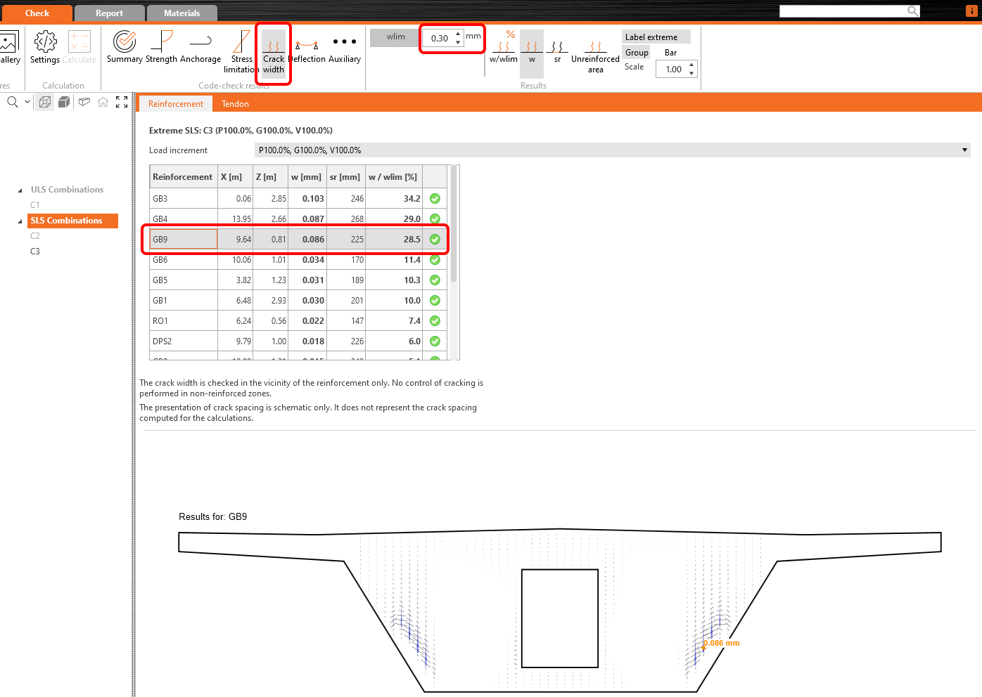The SLS results can be found under the Stress, Cracks and Deflection tabs. In the Stress tab, you will find that the stress in concrete in the bottom corner is unsatisfactory. There is a stress peak.