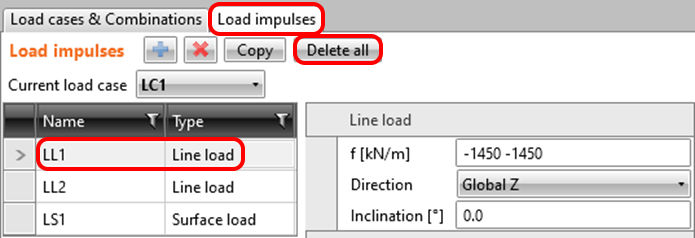 On the Load Impulses tab, delete all loads from the LC1 load case. Load case LC1 will remain empty.
