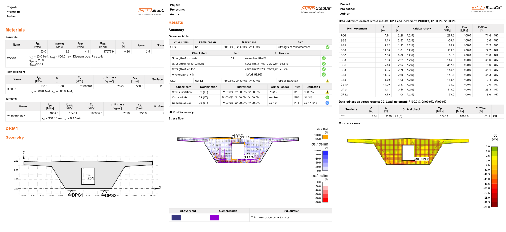 In the table on the bottom left you can see an overview of all the checks, the amount of permanent and variable load applied and the status of the checks (pass/fail). In the table in the middle you can find detailed calculation results. In the figure you can see the result of the design for the ultimate limit state of the concrete.