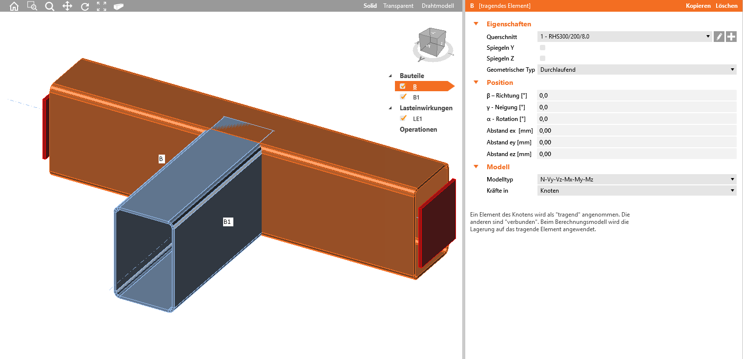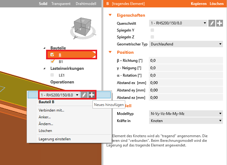 Wir starten mit einem Rechtsklick auf den Träger B und ändern den Querschnitt zu RHS200/150/8.0