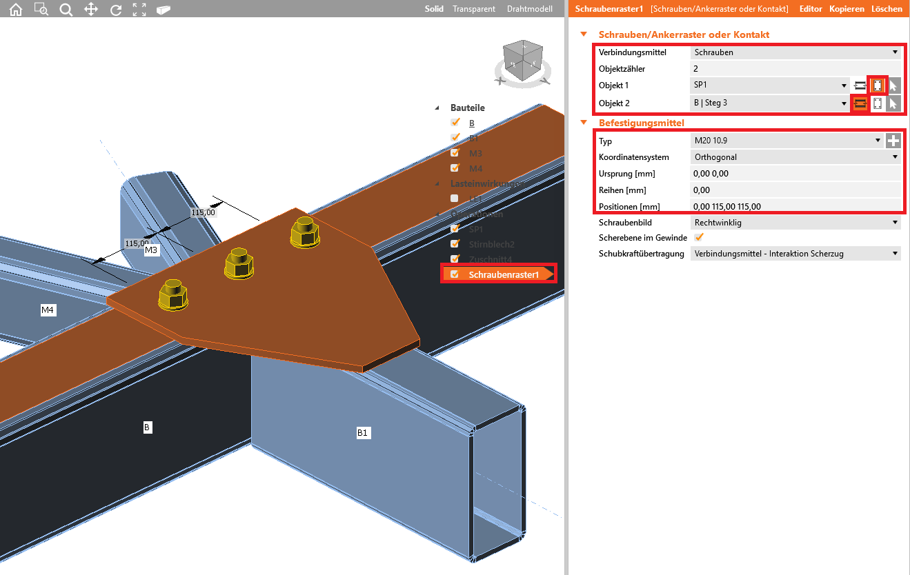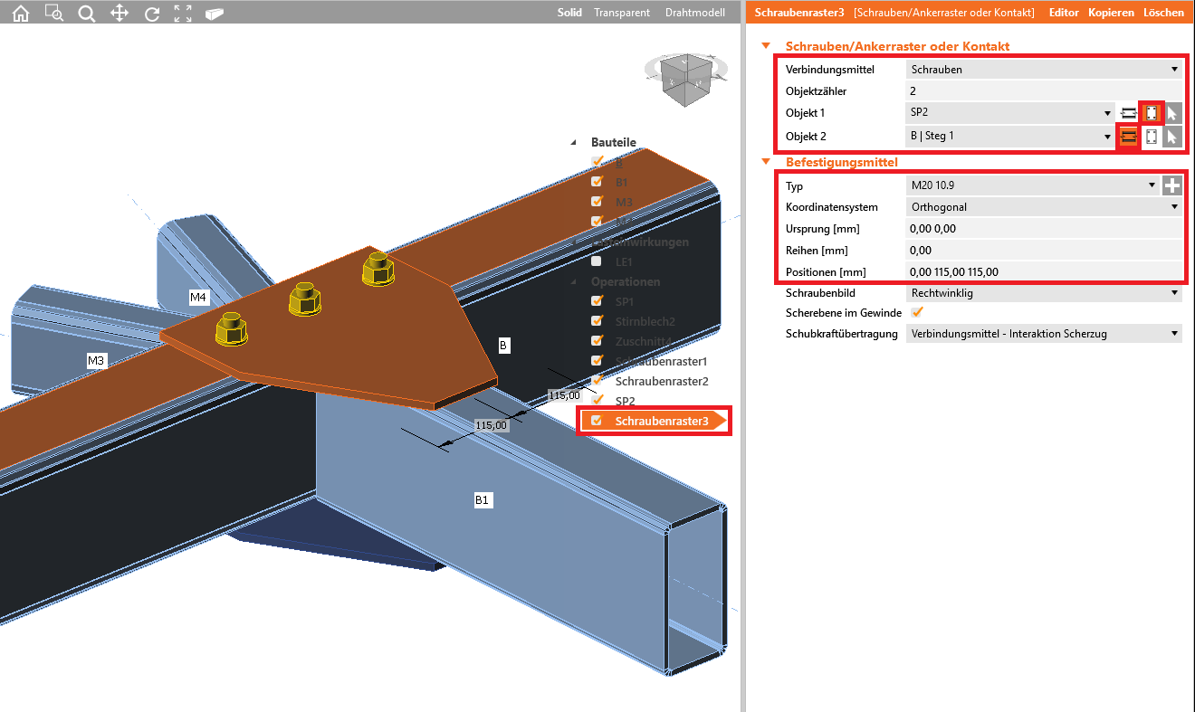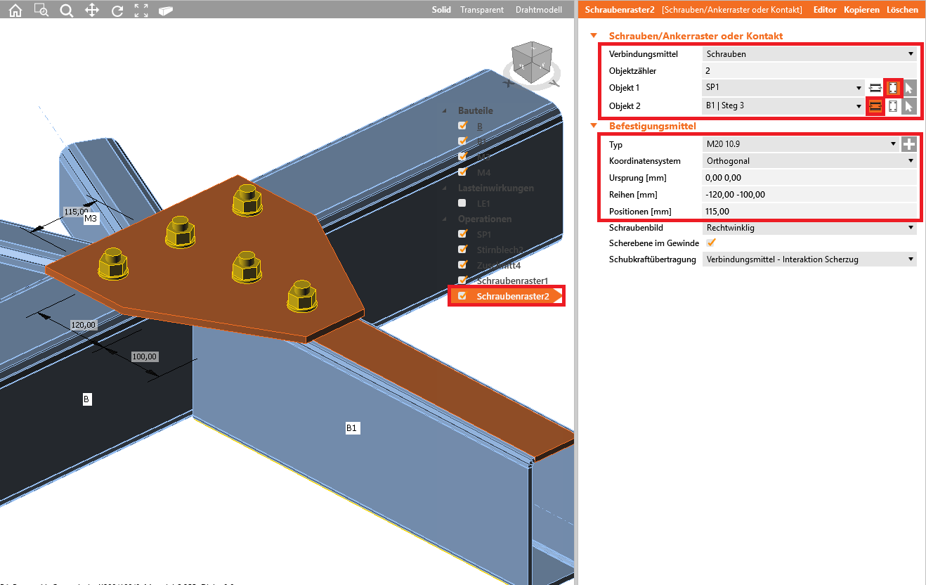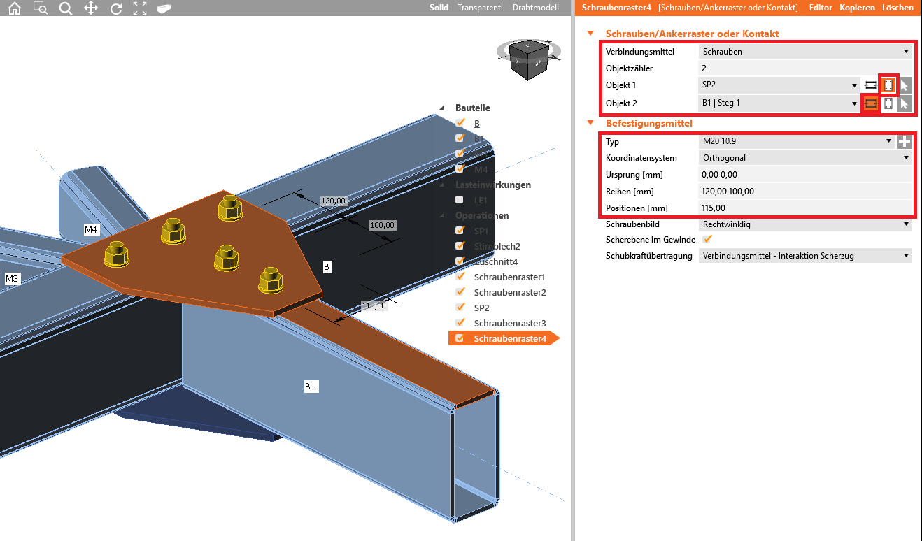 Wir fahren fort und fügen die Operation Schraubenraster3 und Schraubenraster4 hinzu, die jeweils das Aufdopplungsblech SP2 mit dem Bauteil B bzw. B1 mit den nachfolgend angezeigten Einstellungen verbindet.