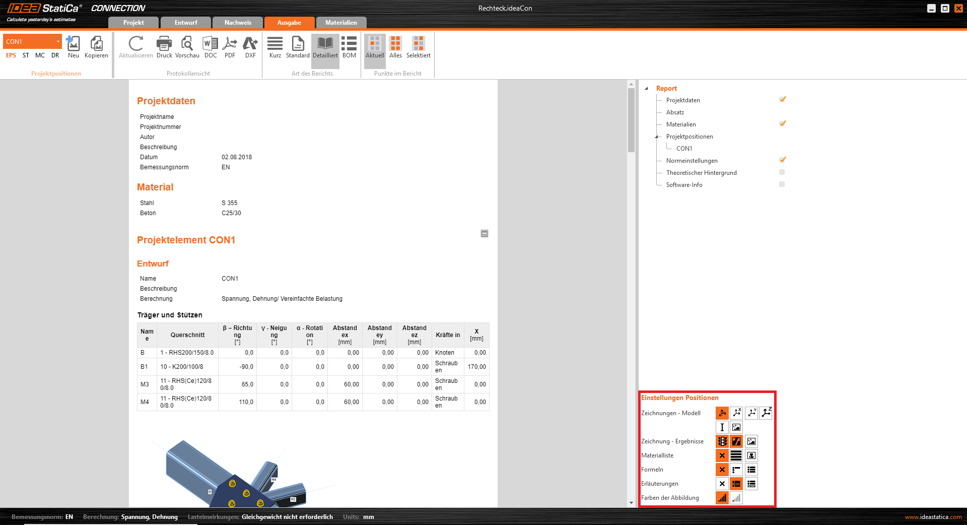 Als Letztes gehen wir zum Abschnitt Ausgabe. IDEA StatiCa bietet eine vollständig einstellbaren Bericht, zum Ausdrucken oder Speichern im zu bearbeitenden Format, an.