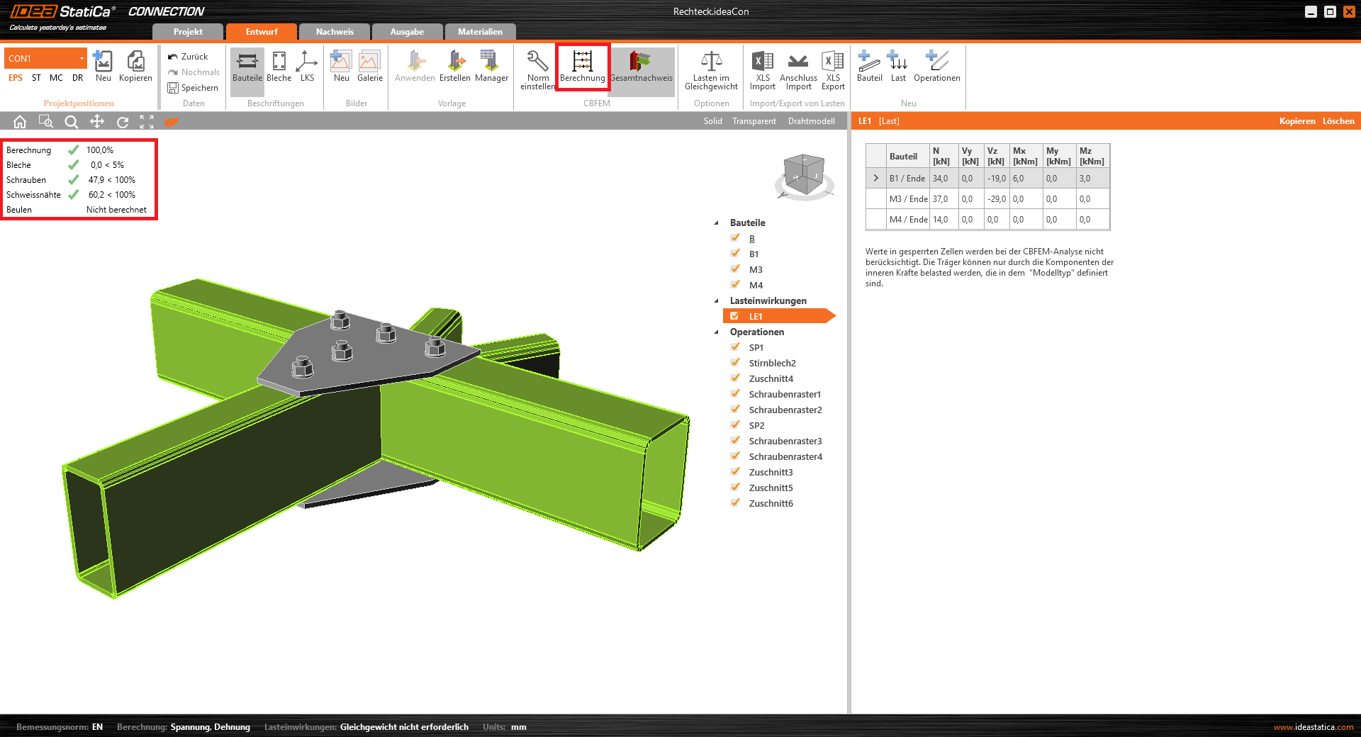 Wir wechseln zum Abschnitt Nachweis, wo wir die Vergleichsspannung, die Schraubenkräfte, das Netz und die Verformung aktivieren, um zu sehen, was im Anschluss passiert.
