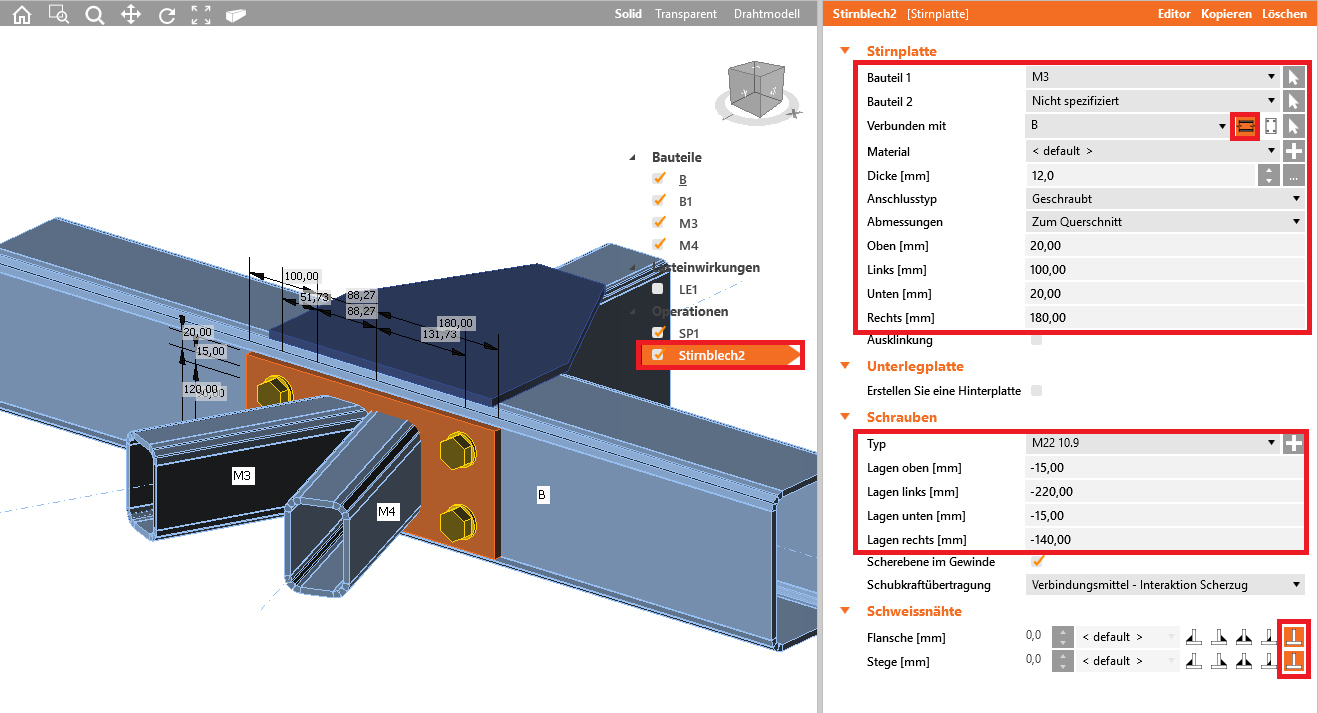 Wir fahren fort und fügen eine Stirnplatte hinzu, welche die Bauteile M3 und M4 später an das Bauteil B anschließen soll.