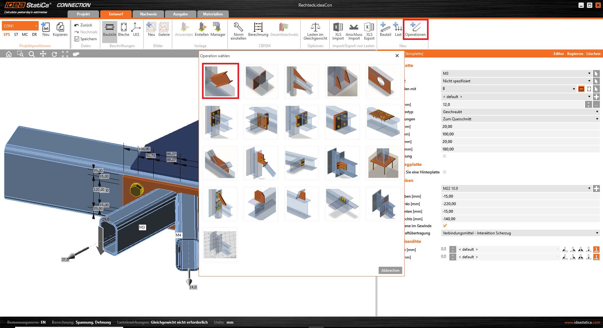 Die Einstellungen für die Stirnplatte und die Schrauben (Festigkeit, Größe, Positionierung) werden gemäß der nachfolgenden Abbildung vorgenommen.