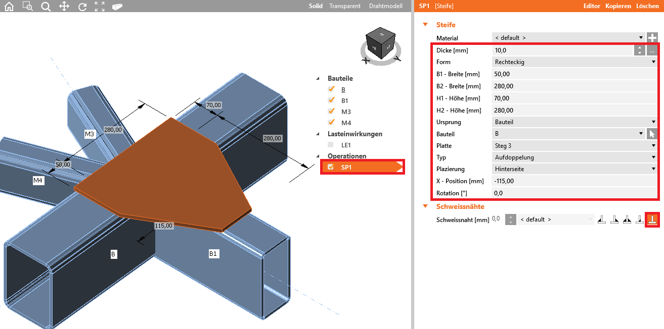 Wir fahren fort und fügen, durch die Kombination Rechtsklick und Kopieren, eine zweite Steife SP2 hinzu, mit der später die Bauteile B1 und B verschraubt werden.