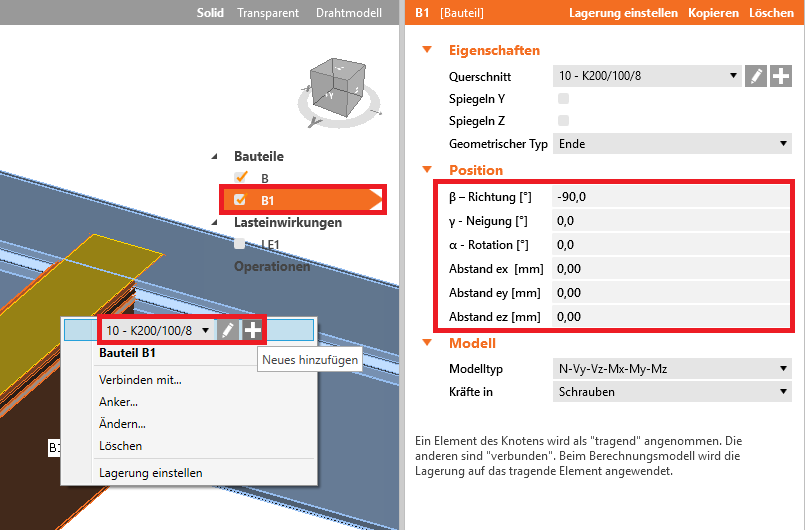 Bauteil B1 - Querschnitt und Ausrichtung einstellen