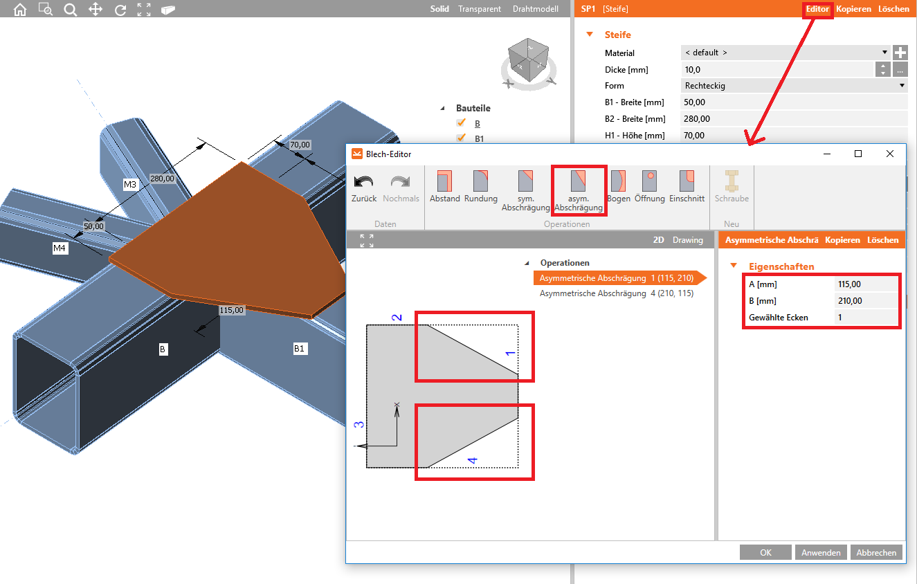 Die polygone Form des Blechs SP1 erreicht man durch Bearbeitung der Ecken im Blech-Editor.