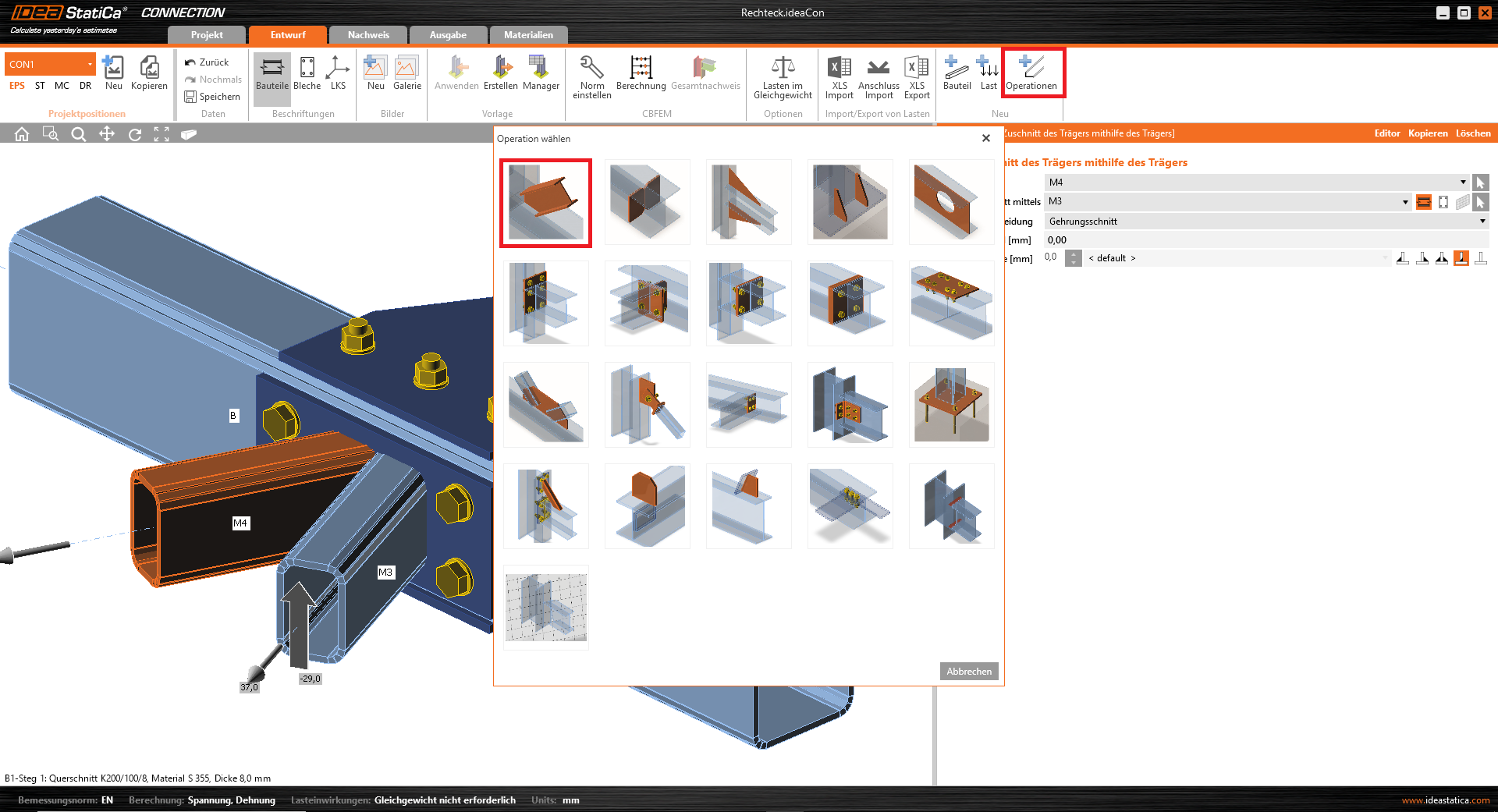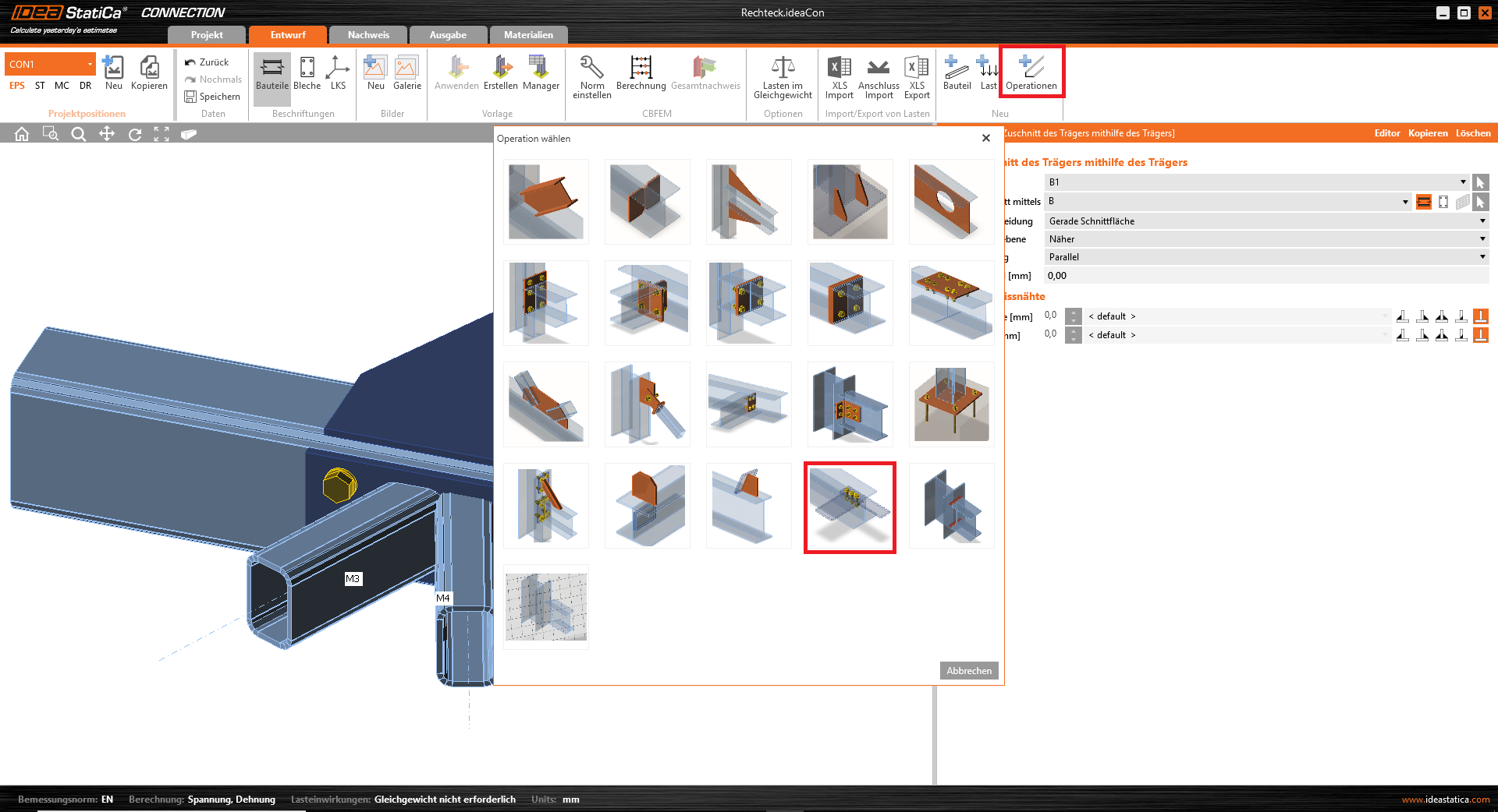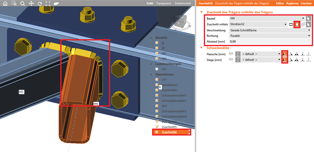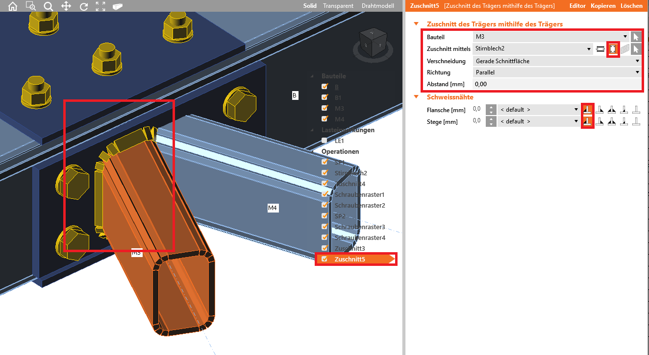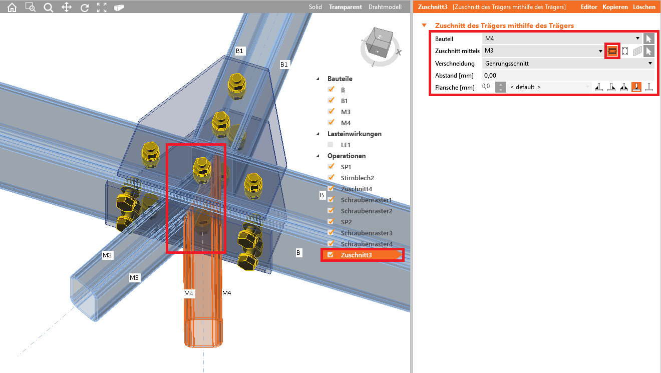 Wir fahren fort und fügen die Operation Schnitt hinzu, die durch einen Gehrungsschnitt zunächst die Bauteile M3 und M4 aufeinander zuschneidet, aber noch nicht mit der Stirnplatte verbindet.