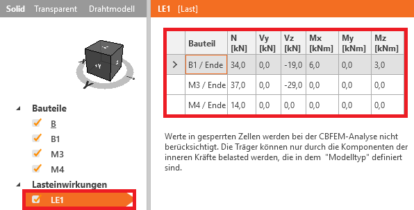 Eine Lastwirkungen wurde automatisch hinzugefügt. Wir geben die Werte der Schnittkräfte in die Tabelle ein. Es können mehrere Lastfälle hinzugefügt werden.