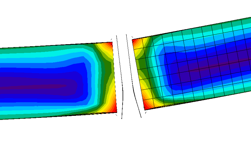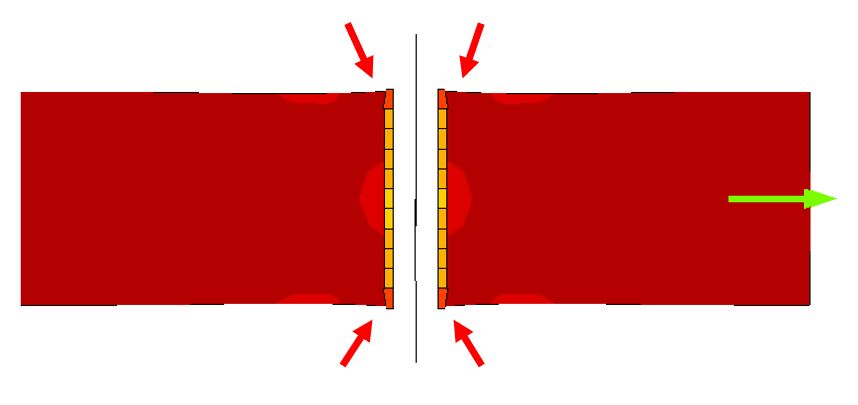 Wenn die Lasten erhöht werden (zur besseren Visualisierung), ist zu erkennen, dass es im Bereich der Bauteilplatte eine Biegeverformung gibt: Die Bauteilplatte verformt sich (Stauchung in der Mitte), die Stirnplatte nicht. Die Längsschubspannungen werden dann aufgrund der an den Plattenrändern entstehenden Dehnungen verursacht.
