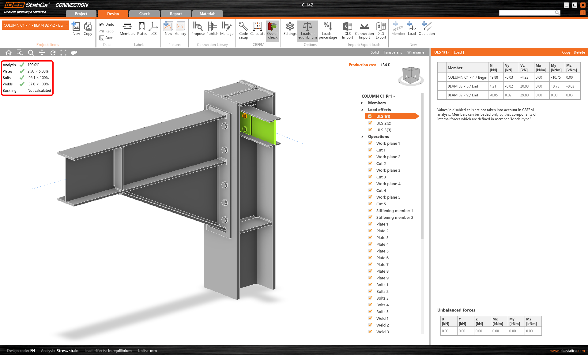 Bei Bedarf können Sie jetzt das Verbindungsmodell weiter ändern (Einstellungen ändern, einige Operationen hinzufügen usw.). Wir empfehlen jedoch, dies nicht zu tun und die Änderungen an den Modellen der Quellensoftware vorzunehmen und sie dann im Code-Check-Manager zu synchronisieren, um die importierten Modelle in IDEA StatiCa zu aktualisieren.