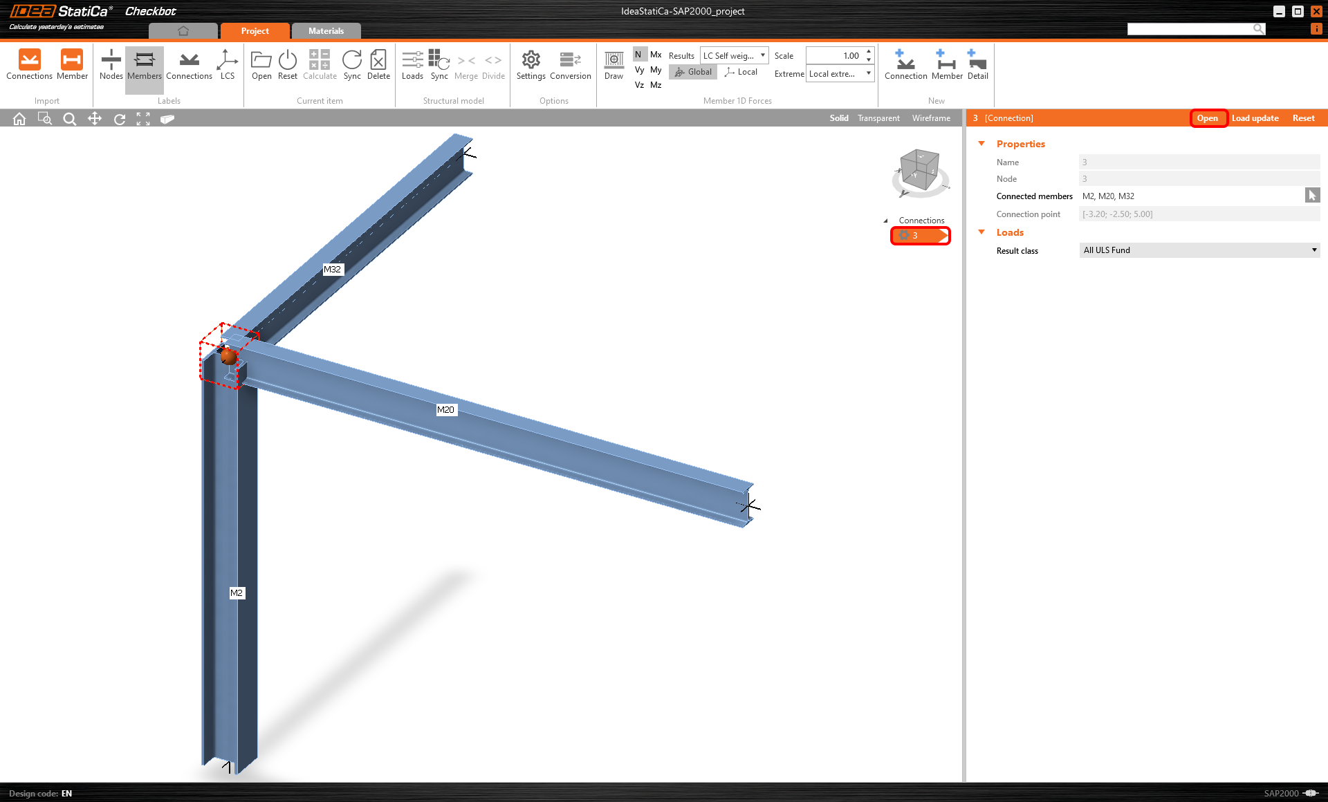 Wählen Sie den Befehl Verbindungsimport und suchen Sie einen Pfad zum zuvor exportierten SAP2000-Verbindungsmodell (es wird auf der Festplatte neben Ihrer SAP2000-Projektdatei im Unterordner Verbindungen gespeichert).