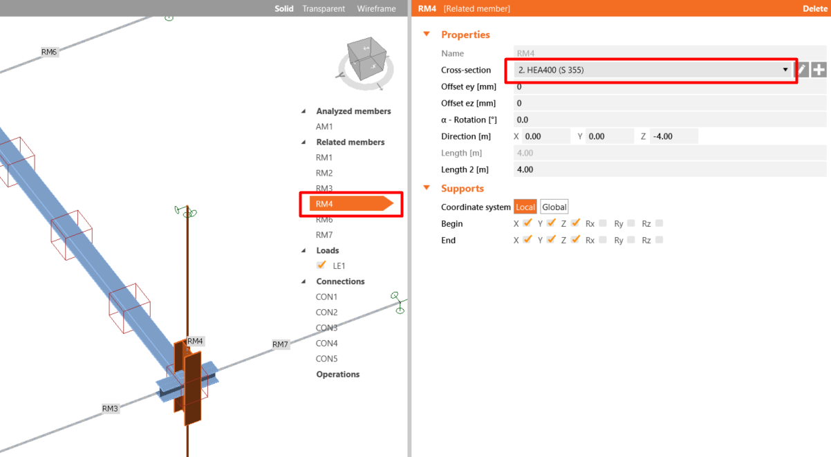 Abschließend müssen alle vertikalen Bauteile (RM2, RM4) auf HEA 400 umgestellt werden.