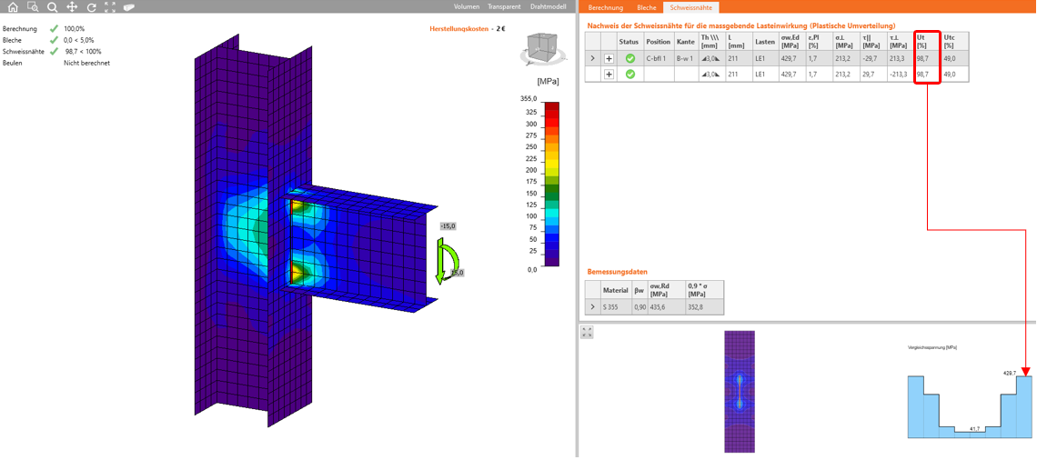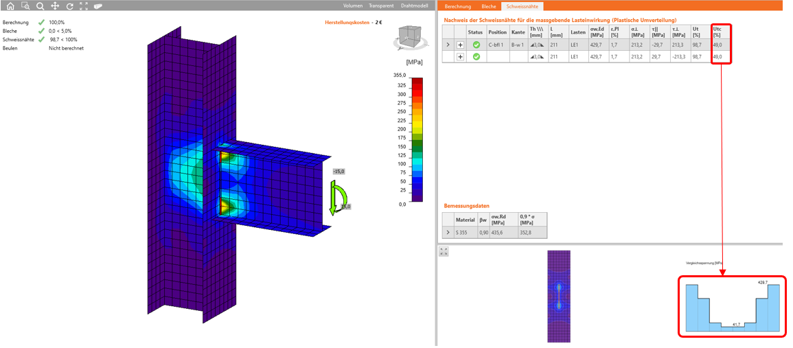 Die höchste Auslastung eines einzelnen Schweißnahtelements kann also nah am Grenzwert liegen, die Auslastung der restlichen Schweißnahtelemente, und damit der Ausnutzungswert Utc, jedoch um einiges niedriger liegen, sodass die Ausnutzung der gesamten Schweißnahtkapazität viel niedriger ausfällt. Zur geeigneten Betrachtung der Ergebnisse und des Spannungsverlaufs sollten daher stets beide Ausnutzungswerte berücksichtigt werden.