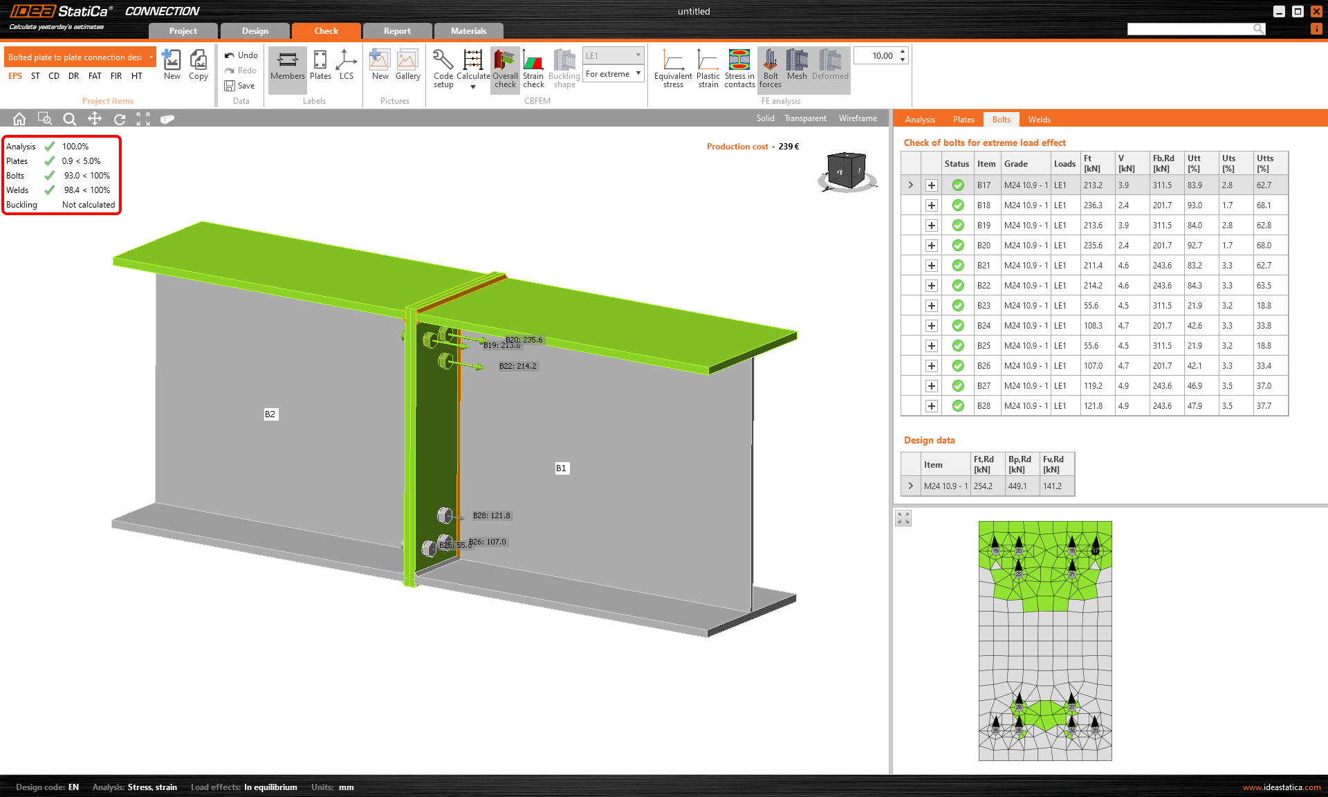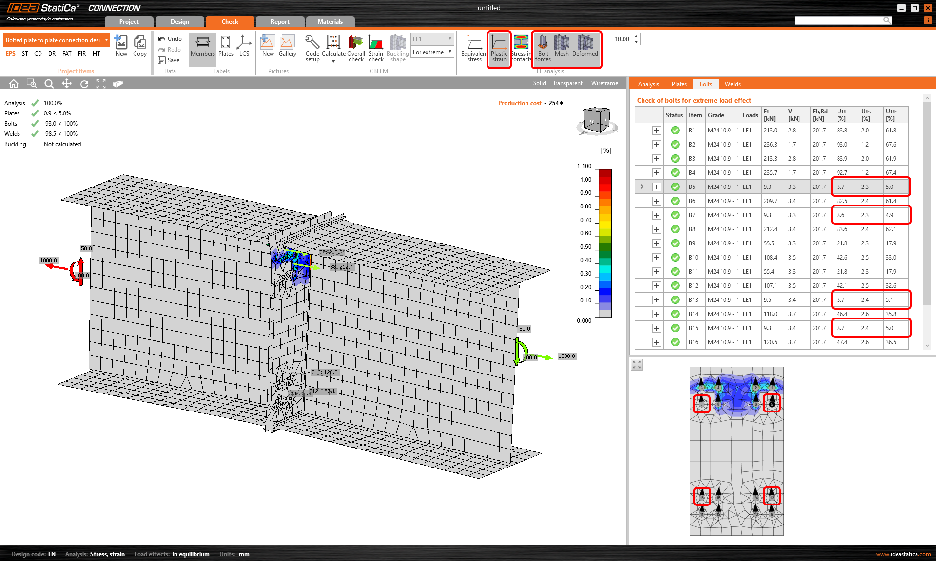 Mehr detaillierte Ergebnisse können im Tab Nachweis angezeigt werden: Aktivieren Sie die Plastische Dehnung die Schraubenkräfte, das Netz und die verformte Form der Verbindung, um ein vollständiges Bild der Vorgänge in der Verbindung zu erhalten.