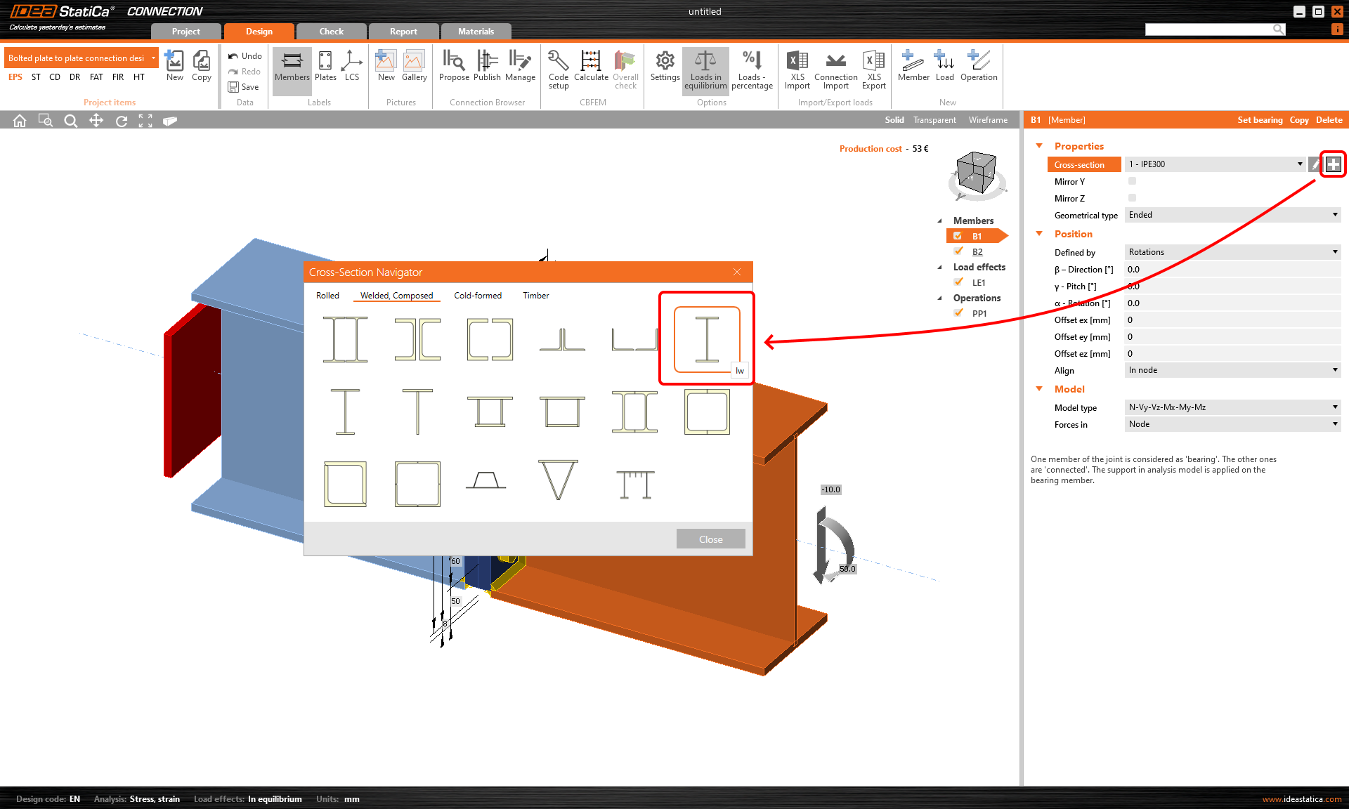 Zwei Träger wurden automatisch hinzugefügt. Ändern Sie den Querschnitt des Bauteils B1 in einen geschweißten I-Querschnitt und definieren Sie die Querschnittsabmessungen (Höhe, Flanschdicke sowie Breite und Dicke des Stegs).