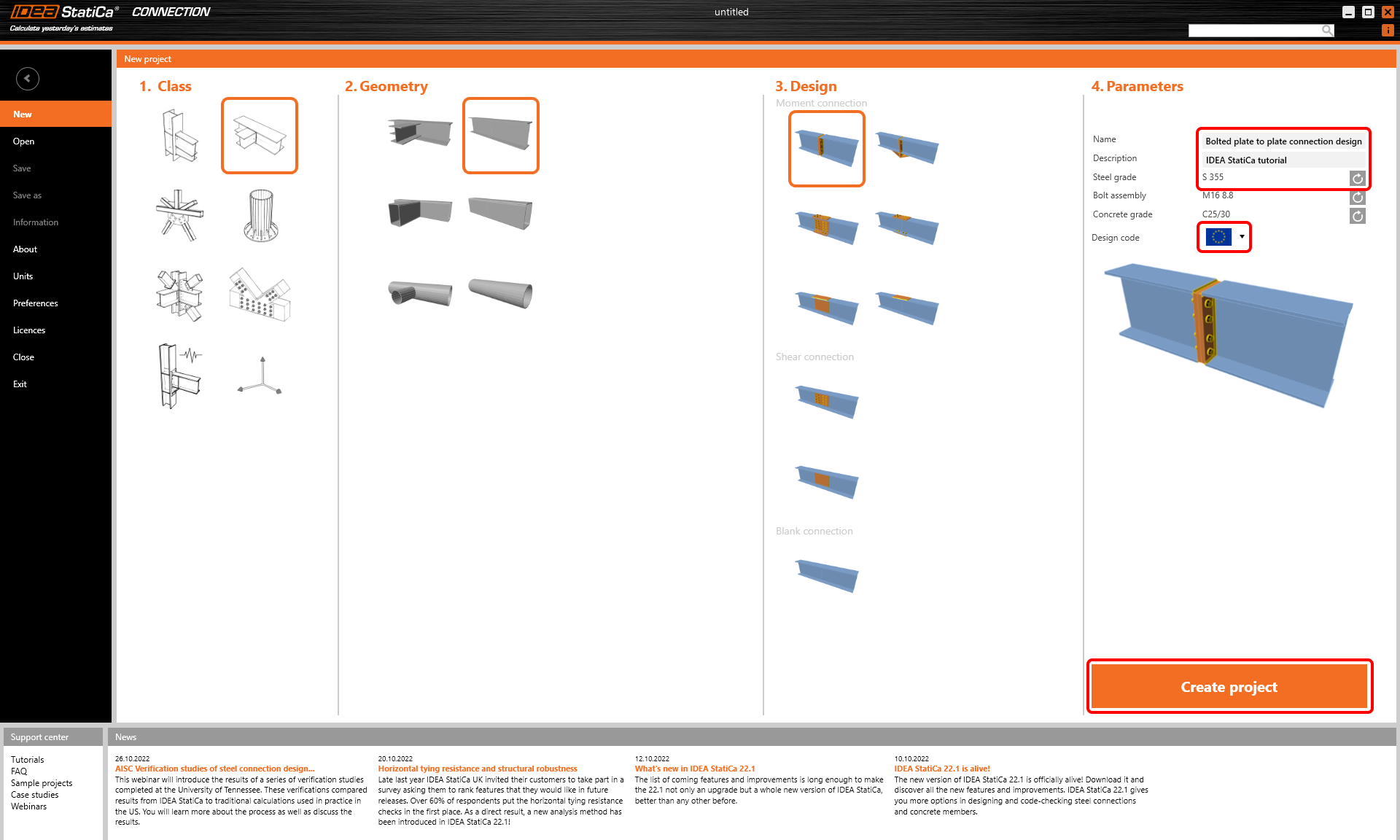 Erstellen Sie ein neues Projekt, indem Sie die Startvorlage auswählen, die dem gewünschten Design am nächsten liegt. Geben Sie den Namen ein und wählen Sie Eurocode als Bemessungsnorm und die Stahlklasse S235.