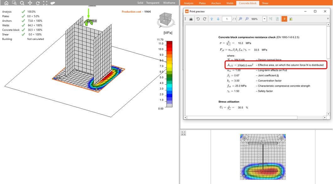 Für den Betonblock wird ein Nachweis für Druckbelastung geführt (Kontaktspannung zwischen Fußplatte und Betonoberfläche; nach EN 1993-1-8, Abs. 6.2.7 und Abs. 6.7), wenn eine Kontaktspannung infolge einer Druckbelastung, von der Fußplatte auf den Betonblock, ermittelt wird.
