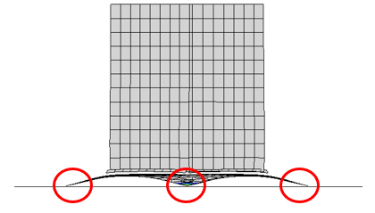 In den Fußplatten können durch Zugwirkungen geringe Kontaktspannungen auftreten, welche durch die Abstützkräfte in den Schrauben verursacht werden; aufgrund der Plattenbiegung verformen sich die äußeren Plattenbereiche in Richtung des Betonblocks.
