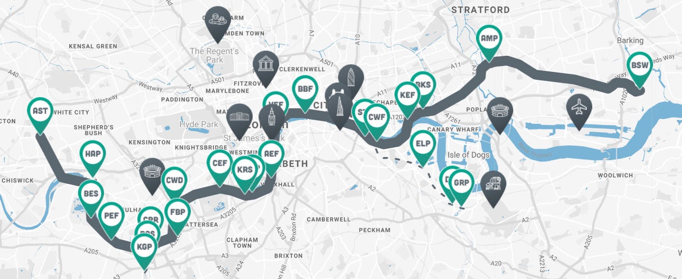 Die Route des Tideway Thames Tunnel mit allen Baustellen