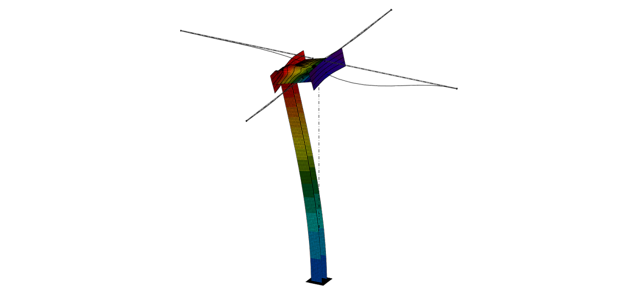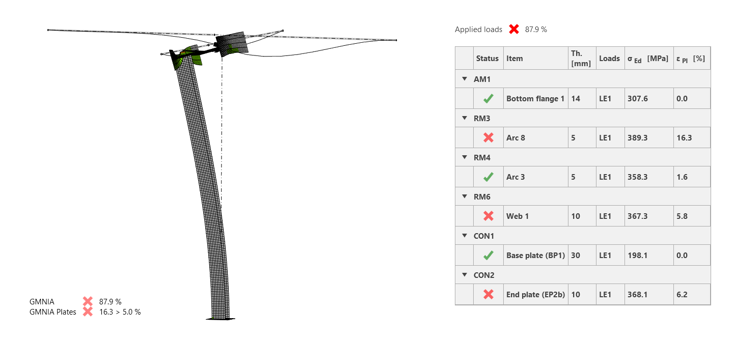 The GMNIA results show a clear failure of the model. The column buckles towards its top, causing the overturning of the beam. This was exactly the failure mode of the real structure.