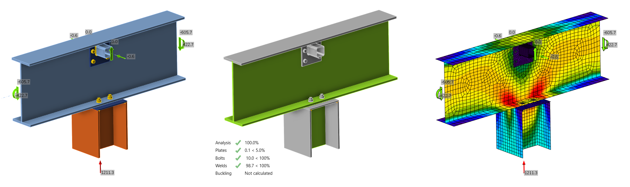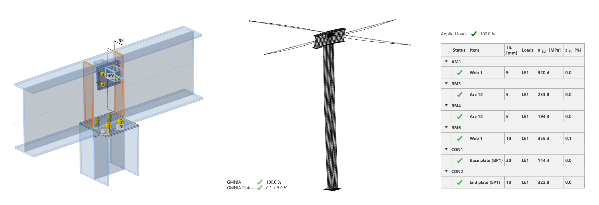 For checking the connections, IDEA StatiCa was used. This involved importing the geometry and load effects via the BIM link to Checkbot, opening the node in the Connection app, designing and calculating it, and delivering the report. As simple as typing these three lines of text, the job took a minute, and all connection parts passed the code checks.
