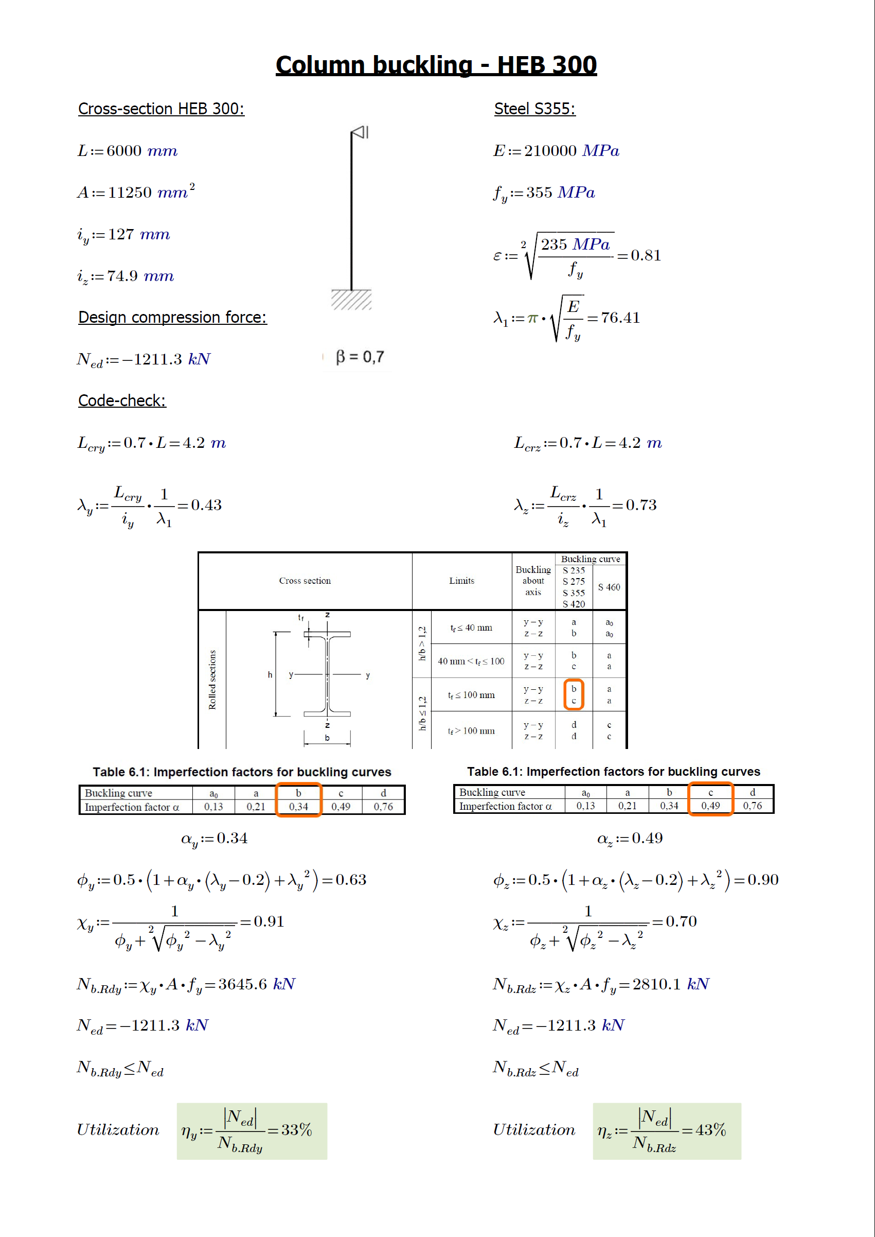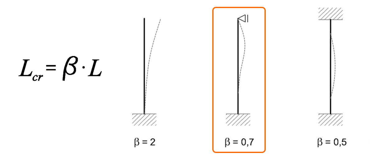 For the column problem of buckling under compression, we choose the fixed bottom and pinned top, since the anchoring is designed as stiff, the top of the column and the top are held by the beam in one direction, and the bracing members in the other direction. This results are in a beta factor of 0.7 in order to calculate the buckling length.