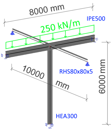 The column HEA 300 is 6 m long and fixed at the bottom by a thick base plate and four M30 anchor bolts. Beam IPE 500 is 8 m long, and it is seated at the column top and loaded at the member axis by a uniformly distributed load of 250 kN/m. The beam is supported on both sides by 5 m long RHS 80x80x5 bracings. All steel is grade S355.