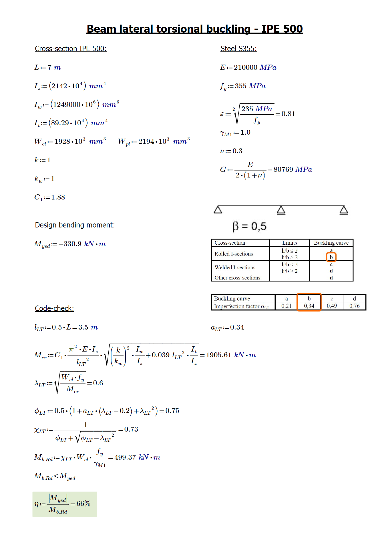 For the beam, we will inspect the lateral torsional buckling of the mid-span between the end support and the column connection. Thanks to the supports on both sides of the mid-span, we determine the beta factor as 0.5.