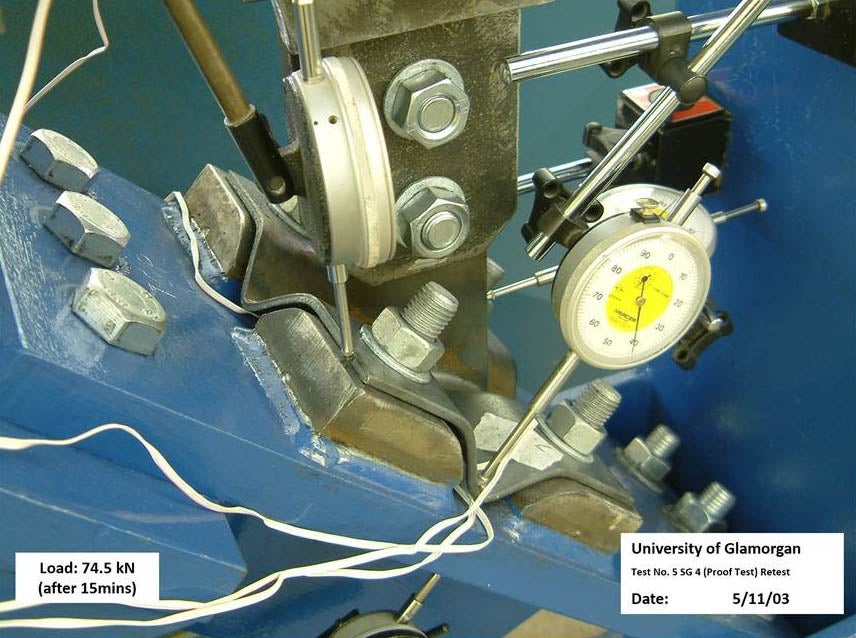 Back in the laboratory, next image shows the stay connection being proof-tested to code requirements (and of course other strength and failure tests not shown here).