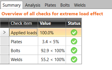 Of course, except pure analysis results, more importantly, IDEA StatiCa Connection provides the overall EN/AISC checks for all elements, as it is shown in the next two images, giving us very clear Pass/Fail results.