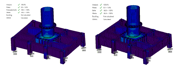 The workflow began with Tekla Structural Designer for base-level modeling, which provided insights into load distributions and pile reactions under standard conditions. From the outset, the team planned to use IDEA StatiCa Connection for detailed connection checks, but as the project evolved, the scope expanded to cover all structural elements in a single model. This shift to a global model, facilitated by IDEA StatiCa’s Component-Based Finite Element Method (CBFEM), allowed Richter Associates to analyze complex load combinations, stress peaks, and fatigue effects comprehensively.