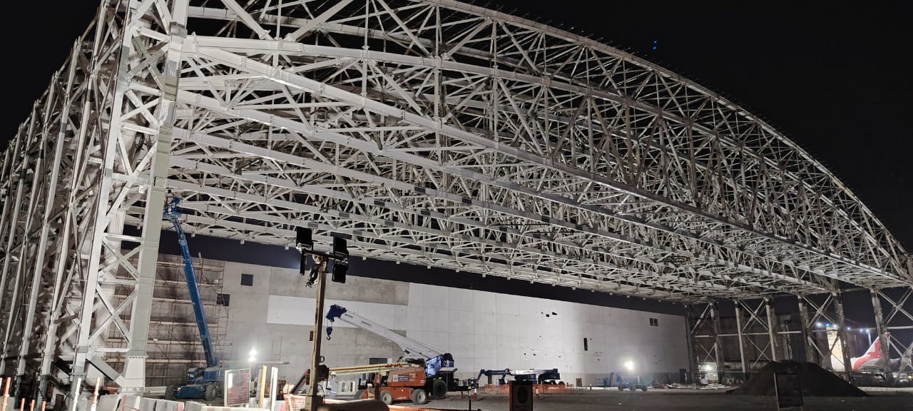 The Air Arabia Hangar is a large-span steel truss structure designed for aircraft maintenance operations at Sharjah International Airport. The hangar’s external dimensions are 136 m wide × 57 m deep, with a minimum clear span of 129.5 m and a crane hook height of 15 m. It accommodates three overhead cranes (6T capacity), mezzanines, skylights, fall arrest systems, and specialized hangar doors.