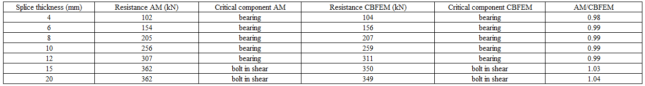 This study is focused on the verification of component-based finite element method (CBFEM) for the resistance of the symmetrical double splice bolted connection to an analytical model (AM).