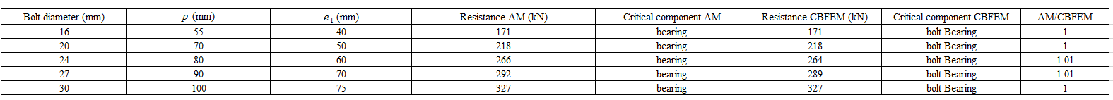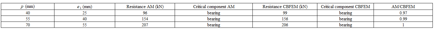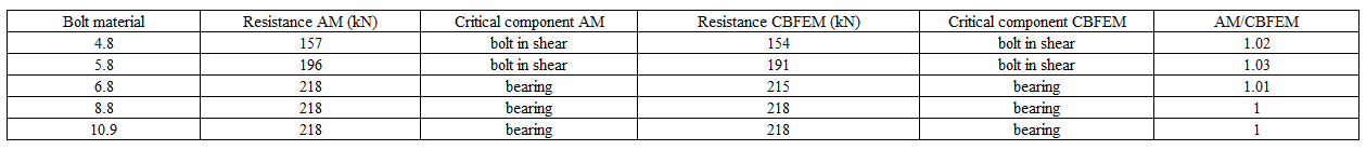Design resistances calculated by CBFEM were compared with results of analytical model (AM). Results are summarised in Tab. 5.2.1. The parameters are bolt material, splice thickness, bolt diameter, and bolt distances, see Figs. 5.2.1 to 5.2.4.