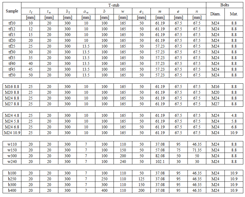 Tab. 5.1.1 Overview of the considered samples of T stubs