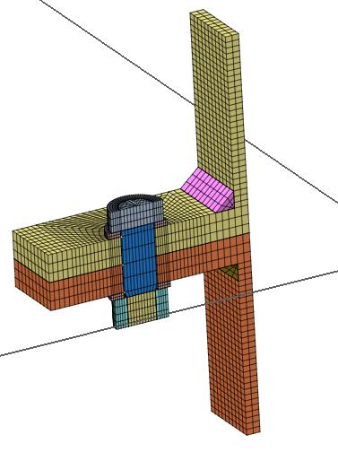 In cases where the CBFEM gives higher resistance, initial stiffness, or deformation capacity, research FEM model (RM) from brick elements validated on experiments (Gödrich et al. 2013) is used to verify the CBFEM model. RM is created in Midas FEA software of hexahedral and octahedral solid elements, see Fig. 5.1.2 Mesh sensitivity study was provided to reach proper results in adequate time. Numerical model of the bolts is based on the model by (Wu et al. 2012). The nominal diameter is considered in the shank, and the effective core diameter is considered in the threaded part. Washers are coupled with the head and nut. Deformation caused by stripping of the threads in thread–nut contact area is modeled using interface elements. Interface elements are unable to transfer tensile stresses. Contact elements allowing the transmission of pressure and friction are used between washers and flanges of the T-stub. One-quarter of the sample was modeled using the symmetry.