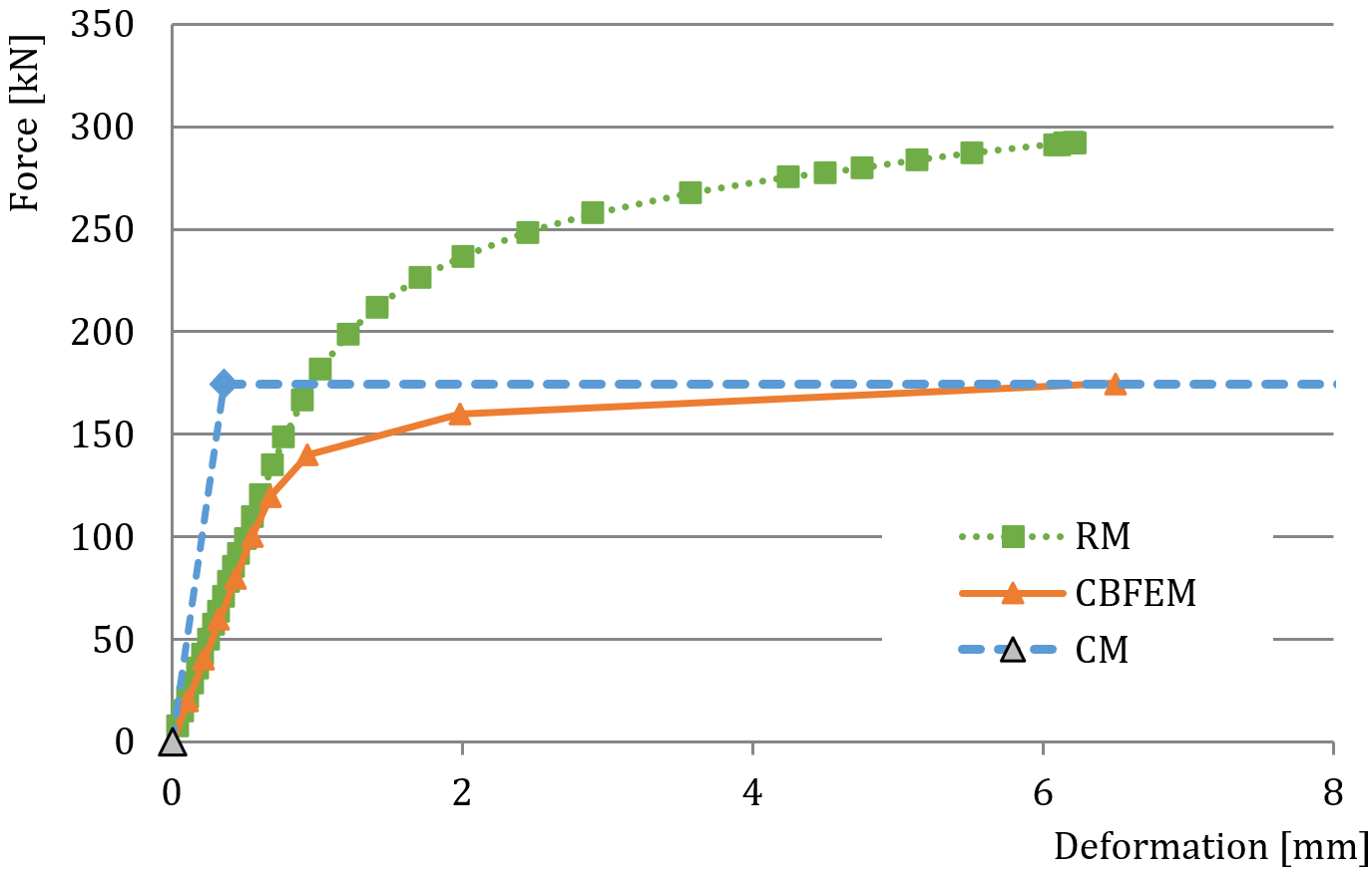 Comparison of the global behavior of the T-stub described by force–deformation diagrams for all design procedures was prepared. Attention was focused on the main characteristics: initial stiffness, design resistance, and deformation capacity. Sample tf20 was chosen to present as a reference; see Fig. 5.1.4 and Tab. 5.1.2. CM generally gives higher initial stiffness compared to CBFEM and RM. In all cases, RM gives the highest design resistance, as shown in chapter 6. Deformation capacity is also compared. Deformation capacity of T-stub was calculated according to (Beg et al. 2004). RM does not consider cracking of the material, so the prediction of deformation capacity is limited.