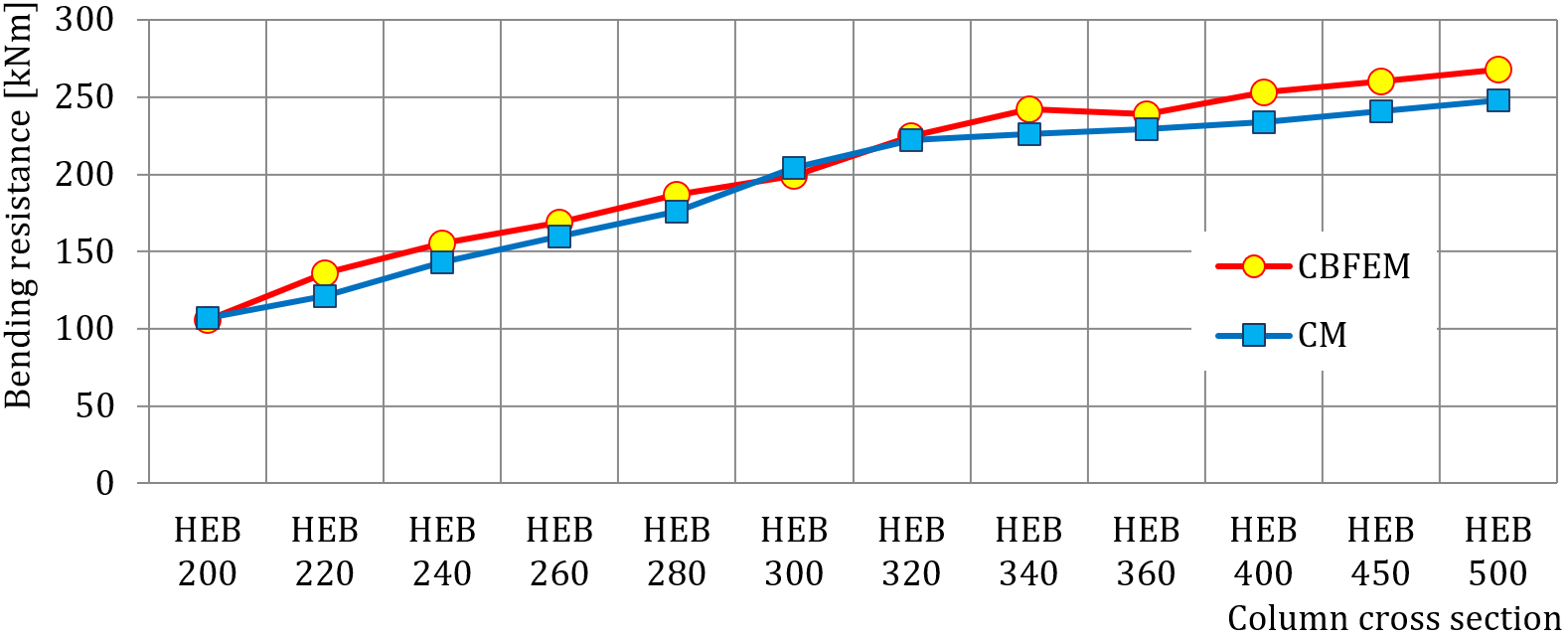 Design resistance calculated by CBFEM was compared with the results of the component method in the next step. The comparison was focused on the resistance and also the critical component. The study was performed for the column cross-section parameter. Beam IPE 330 is connected to the column by extended endplate with 5 bolt rows. Bolts M24 8.8 are used. The dimensions of the end plate P15 with bolt end distances and spacing in millimeters are the height 450 (50-103-75-75-75-73) and the width 200 (50-100-50). The outer edge of the upper flange is 91 mm from the edge of the end plate. Beam flanges are connected to the end plate with welds with the throat thickness of 8 mm. The beam web is connected with the weld throat thickness of 5 mm. The column is stiffened with horizontal stiffeners opposite to beam flanges. The Stiffeners are 15 mm thick, and their width corresponds to the column width. The thickness of the end plate stiffener is 10 mm, and its width is 90 mm. The results are shown in Tab. 9.2.2 and Fig. 9.2.3.