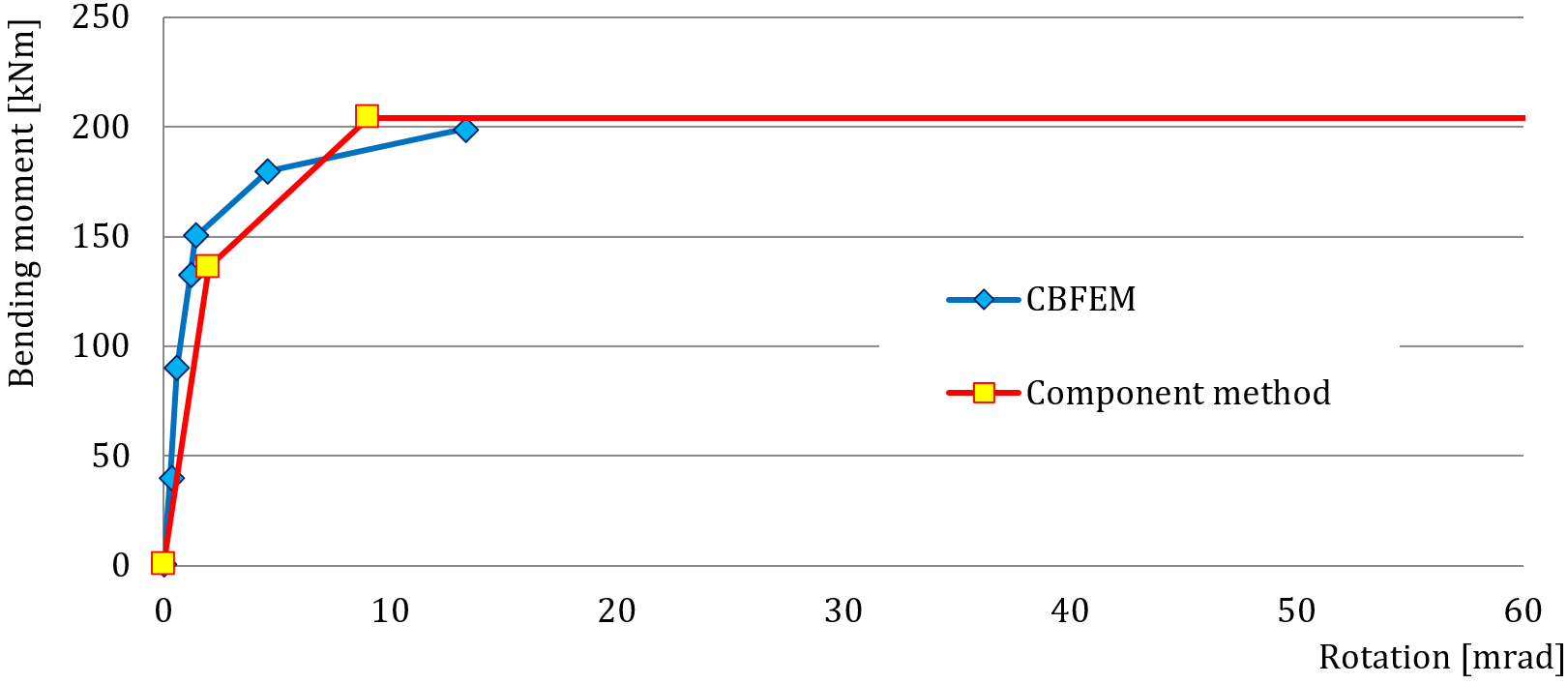 Comparison of the global behavior of the joint, described by moment-rotation diagrams for both design procedures mentioned above, was done. Attention was focused on the main characteristics of the moment-rotation diagram: initial stiffness, design resistance, and deformation capacity. Beam IPE 330 is connected to column HEB 300 using extended end plate with 5 rows of the bolts M24 8.8. The results of both design procedures are shown in the graph in Fig. 9.2.2 and in Tab. 9.2.1. CM generally gives higher initial stiffness compared to CBFEM. CBFEM gives slightly higher design resistance compared to CM in all cases, as shown in Chapter 9.2.5. The difference is up to 10%. Deformation capacity is also compared. Deformation capacity was calculated according to (Beg et al. 2004) because EC3 provides limited background for deformation capacity of endplate joints.