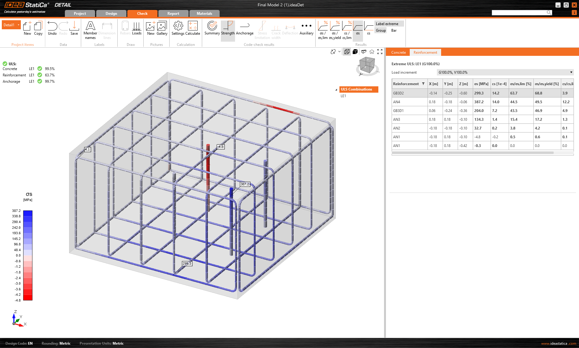 En detalle, los anclajes se comprueban como las barras reforzadas regulares de acuerdo con los diagramas de tensión-deformación definidos para materiales particulares mientras se utiliza el valor de la deformación límite como máximo 5% (calculado en base al efecto de rigidización por tensión leer más en TB)