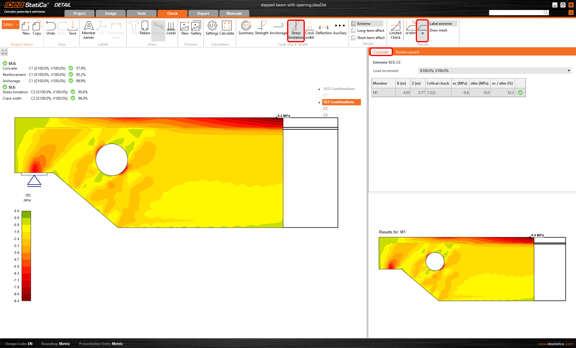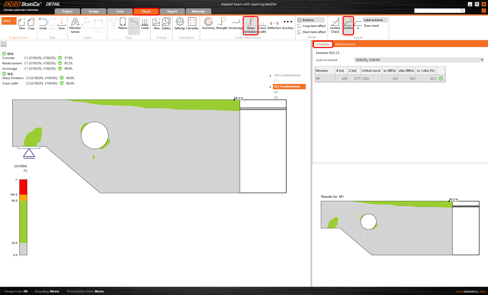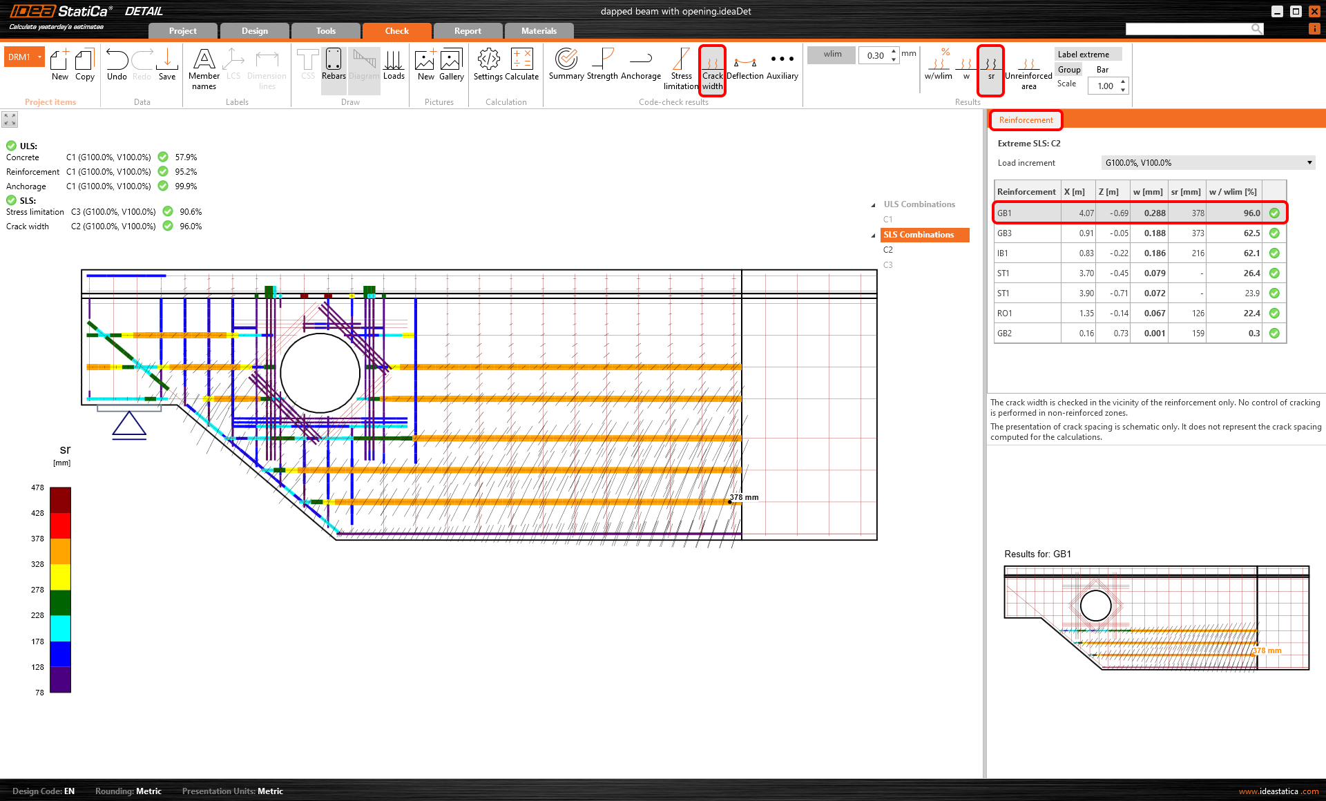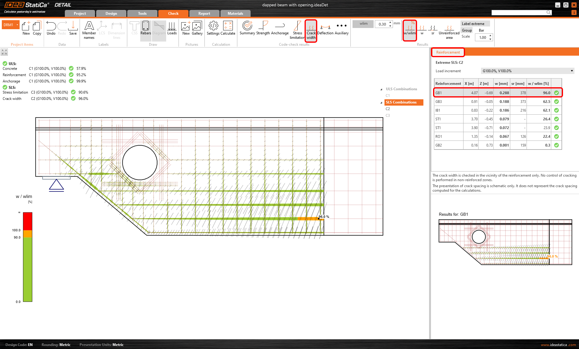 El valor límite wlim puede ajustarse en la cinta superior. El valor wlim = 0,3 mm se establece por defecto de acuerdo con el Eurocódigo. Los resultados se diferencian de nuevo por colores (verde/naranja/rojo) para que la comprobación sea obvia a primera vista.