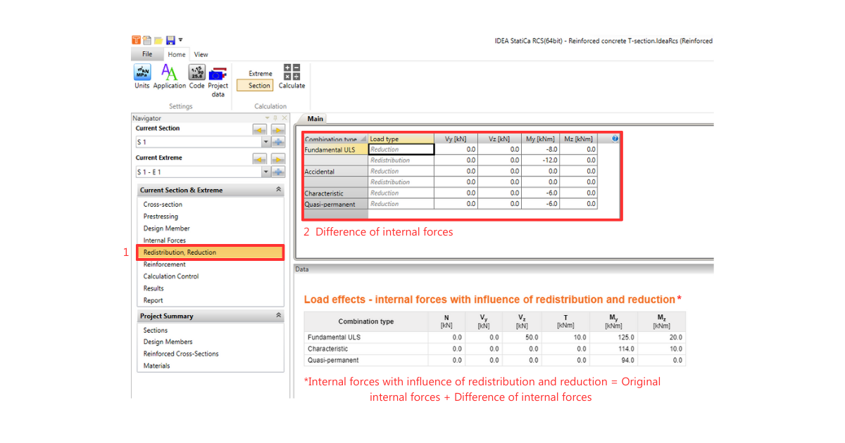 Here you have to manually enter the difference of internal forces obtained from the calculation according to Eurocode. The software will then automatically recalculate the internal forces by the entered values.