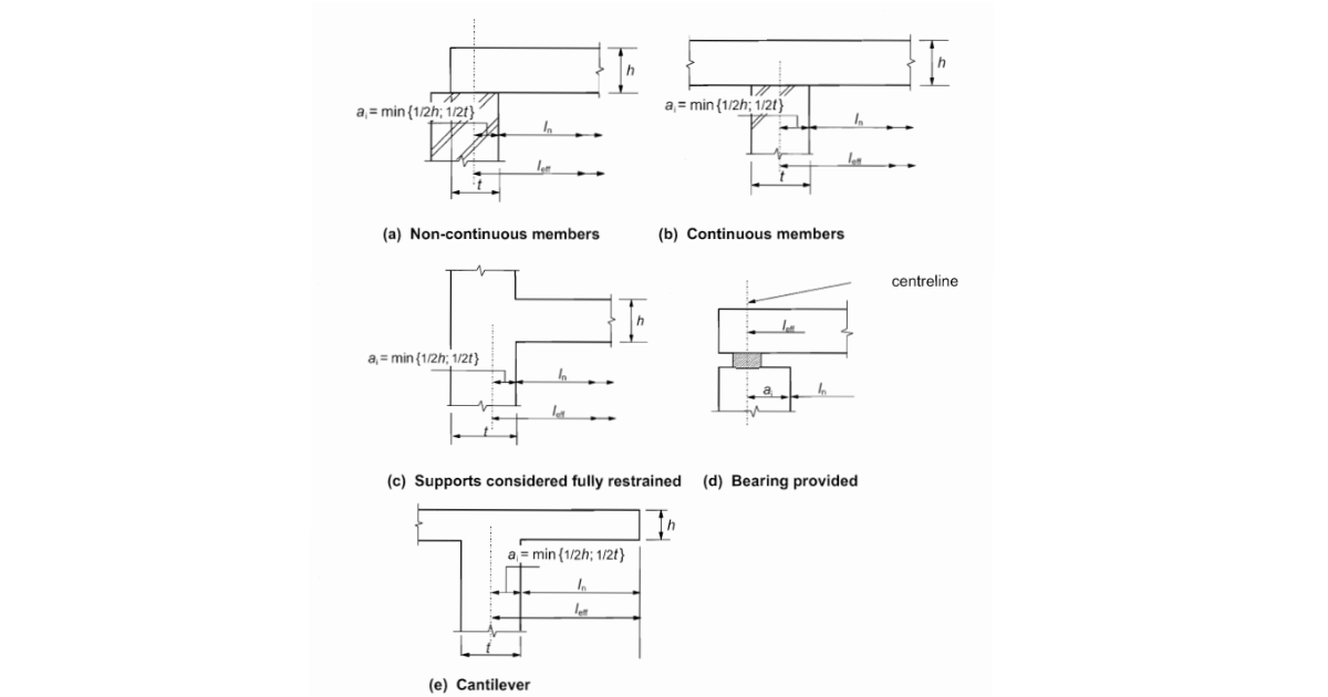 The software will calculate the effective length of member leff for you. All you need to do is to set a clear distance between the faces of supports ln, set support conditions (see the figure below), and set the width ti of the supporting element.