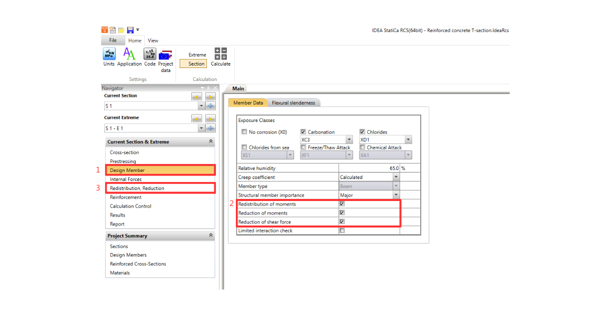 Go to the Navigator -> Design member -> Member Data. You will find a part dedicated to the environment (Exposure Classes, Relative Humidity) and other settings (Creep coefficient and Structural member importance) common for all member types (Beam, One-way slab, Compression Member). The rest of the tab is available only for Beam and One-way slab, and it allows us to tick/untick checkboxes for the reductions and redistribution. See the detailed picture below.