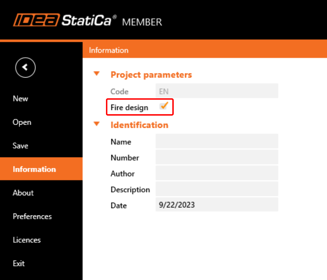 To calculate the Fire design in existing project, enable this feature by clicking on the top ribbon Project button and ticking the Fire design checkbox in the information.