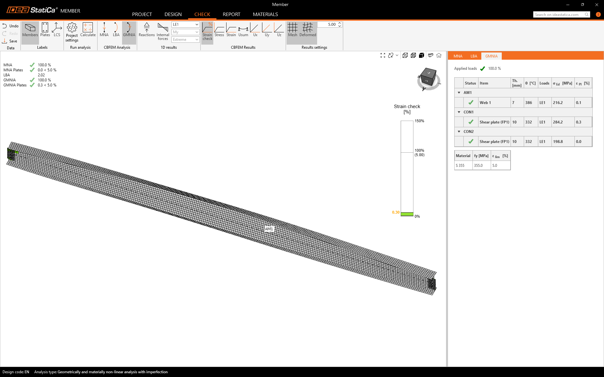 Here you can see the final results of the GMNIA calculation. Calculated stresses and strains with reduced material properties, according to the calculated temperature and set imperfections, are satisfactory. This means our design is safe for these conditions.