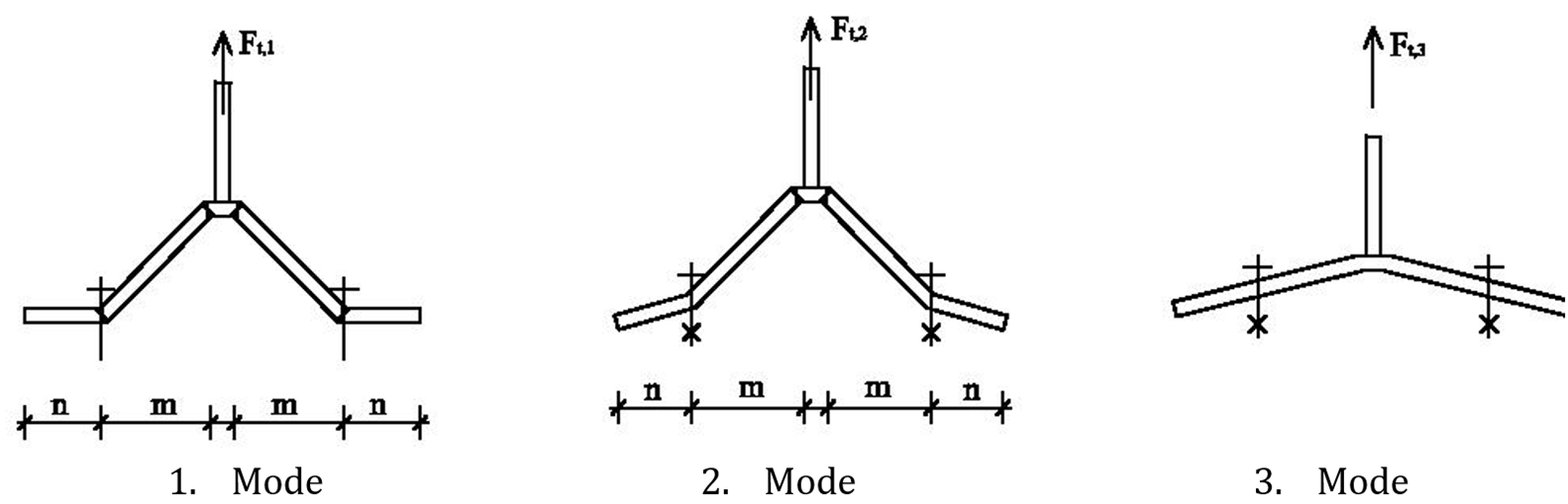 Only tension loads are considered in this study. Effective lengths for circular and noncircular failures are considered according to EN 1993-1-8:2005, Cl. 6.2.6. Three modes of collapse according to EN 1993-1-8:2005, Cl. 6.2.4.1 are considered: 1. mode with full yielding of the flange, 2. mode with two yield lines by web and rupture of the bolts, and 3. mode for rupture of the bolts; see Fig. 1. Bolts are designed according to Cl. 3.6.1 in EN 1993-1-8:2005.